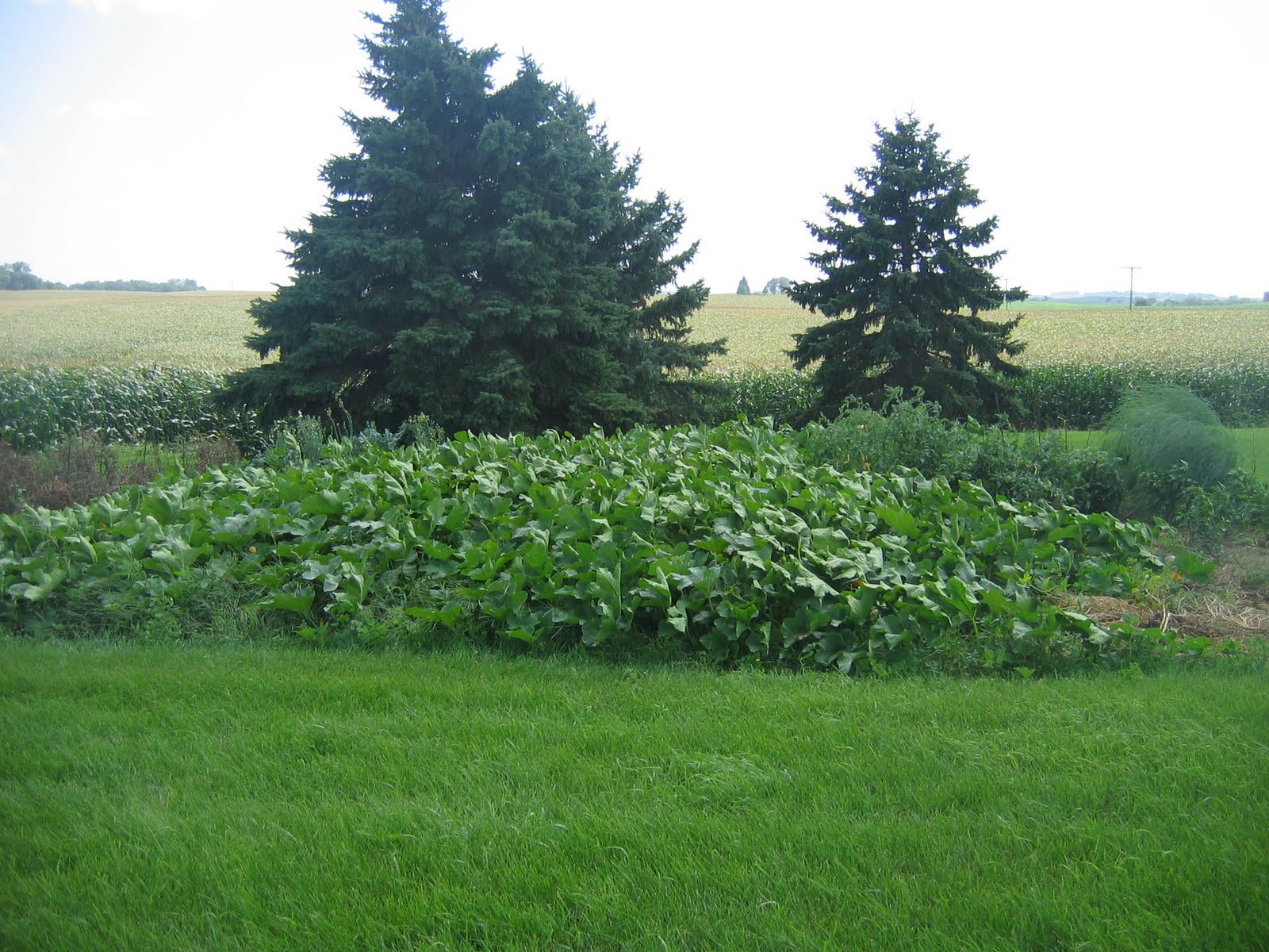 These are not jack-o-lantern pumpkins, but pie pumpkins which are a bit smaller with a yummier meat to them, since we’re now addicted to all of those pumpkin recipes that we tried last year. If you can see, the far right of the garden is my asparagus plants which are done for the year. A bit to the left of that in the back are the 10 tomato plants that we’re harvesting now. We have “healthy kick” roma tomatoes with twice some of the vitamins of normal tomatoes, and “big boy” tomatoes which are huge now, but not red yet. Beating back the vine away from these tomato stalks have been a daily job. The vines have wrapped around, grown inside, (Knut found 2 pumpkins growing INSIDE of the tomato stalk one day) growing over, under, around…you name it. There was a cucumber vine that was much smaller that got swallowed up by this pumpkin vine. It’s under there somewhere.