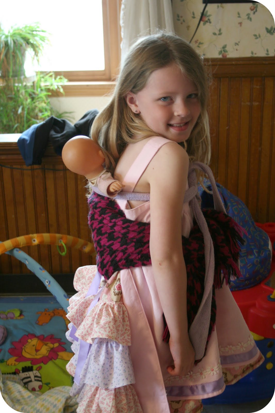 Silje wanted to “wear” her baby on her back while she picked up toys, just like Mommy does.