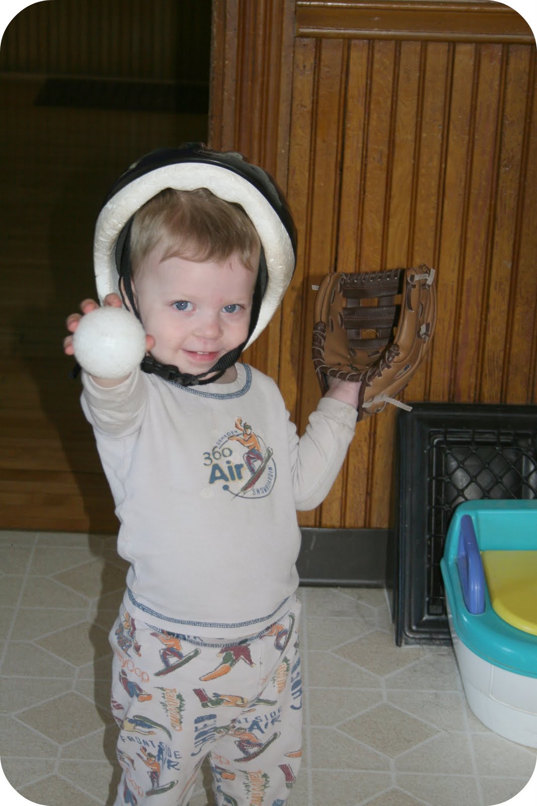 There’s a new ball player around here. (Yes, that is a potty chair next to him. No, he still won’t go in it. Yes, David has tried to pee in it a few times since I’ve pulled it out. I had him “demonstrate” for Elias, and ever since them I’ve caught him using that one several times. You know, it’s less fussy than that fiddly flushing kind.)