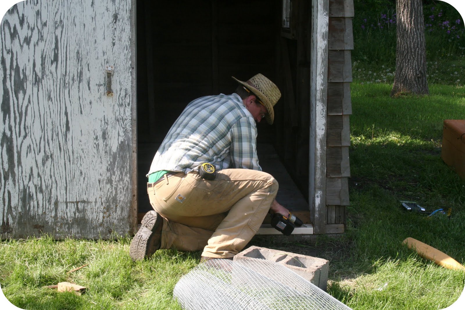 So he nailed up some more boards in some places, and put mortar against the crack-y cement slab in other places. He did a way nicer job to installing the chicken wire over the windows than I would have done. He’s a perfectionist at heart, and it was driving him mad that this was a really old shed that was never going to look totally perfect. I tried to encourage him that it’s for chickens…not his grandma.