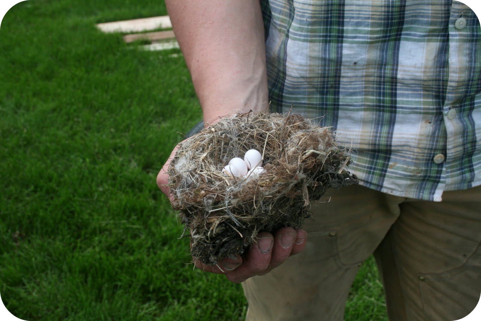We’re all pretty excited about the chickens moving into their coop. Well, all of us except for mama bird who had a nest full of eggs that we found in the eves of the old-shed-turned-coop. Mama bird swooped and chirped and was downright angry when we moved her precious nest. Hopefully everything is all right with that little family that has been evicted. I’m sure there was a more proper way to do it, but we didn’t touch the eggs and Knut relocated it to the woods where the barn swallow kept a close eye on him. The kids and I got to see the eggs, though, and it’s one of those times when the mystery of nature takes your breath away. God’s creation is a wild and amazing thing, isn’t it? Hopefully the eggs will come to no harm, although we’ll never know. The mother darted into the woods after it, but “they” say she will reject them. One thing this reassures us of is that birds like to lay eggs in this spot and that is just what we are hoping!