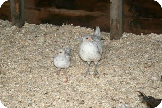 I’ve even seen Selina, our mini-chicken who had pasty-butt in the beginning walk all over Princess. See, here’s Selina next to another of her same breed. She’s growing fine now, but is still behind the other birds.