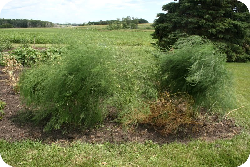 This is what asparagus plants look like when they are past their season. Our asparagus patch has been growing steadily every year and is the most fought over vegetable at the table. We harvested every stock we could this year and ate it for supper several nights in a row and had to count out pieces for the kids as they were sure they were going to be swindled from their share. Right now it’s gathering seeds and nutrients for the next year and when it turns brown this fall we’ll cut it down for the winter.