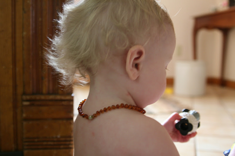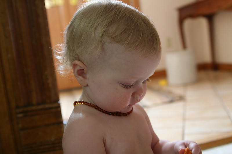 I mentioned a few months back that I was going to try the “amber teething necklaces” and tell you what I thought…honestly. They seem to be all the rage these days. Just a review amber is fossilized tree sap. They’re not magic fair teething stones invoking some mythical god. The idea is to wear the necklaces to get the benefit. The baby does not chomp on the necklace like a teething ring. It’s nothing like a teething ring.