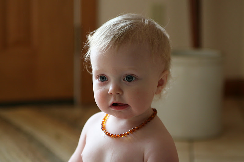 I got the necklace with the magnetic closure so it could easily be yanked off because I’m paranoid like that. I also got one that was too long, and sort of regret that. I would have liked a shorter one because this one flops outside her clothes often and it doesn’t work unless it’s resting right against the skin so the amber qualities can be absorbed. She never wears it when she’s sleeping, but I’ve found if she wears it for a few hours in the day, it makes the nights easier.