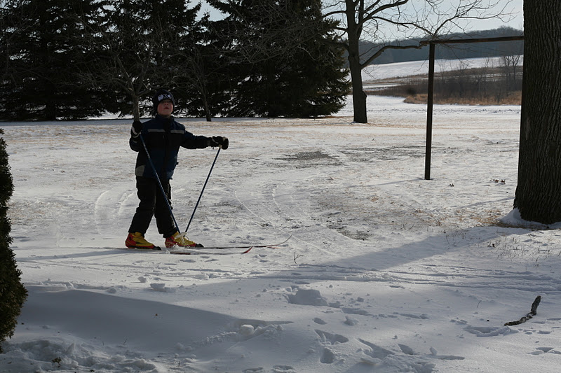 David skied around the yard to show him how it was done. After he sped around for about 10 minutes, he enticed Elias to leave the driveway and go off into the yard and loop around the playground, chicken coop, and come on back.