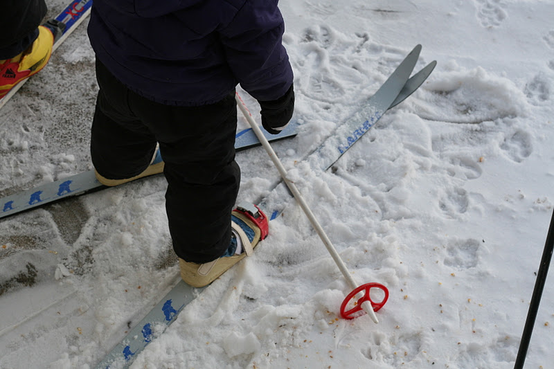 David really wanted to go skiing with someone yesterday, and he didn’t have to twist Elias’ arm too hard to convince him to come along. David got Elias’ skis on all by himself. He spent a lot of time trying to get Elias to hold his poles right, and poor Elias who still has trouble getting his thumb in the hole of his mitten had a tough time gripping it properly.
