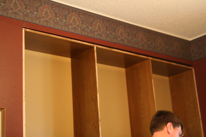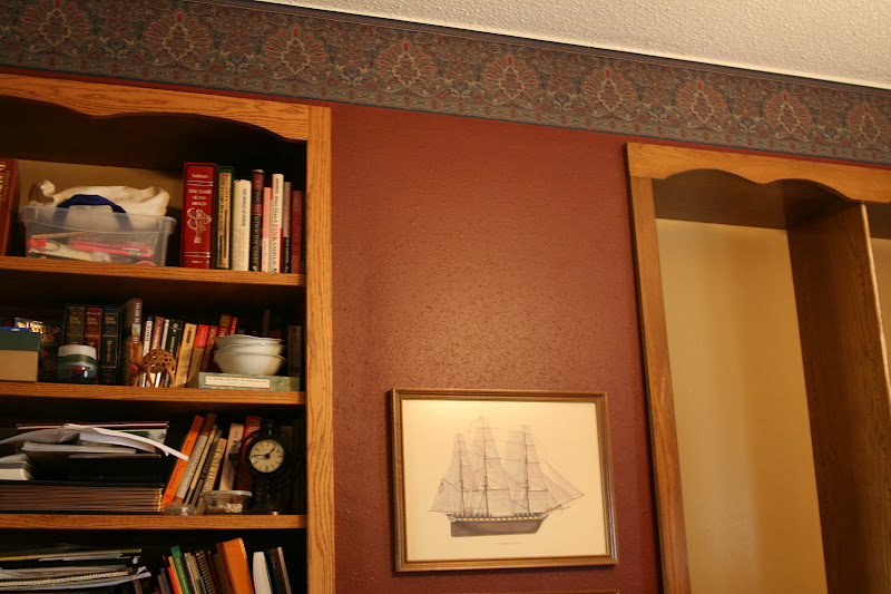 As you can see, when Knut set up his level shelving structure, that the right hand side has about a 2″ bigger gap on the right side than the left. To make the horizontal lines that don’t match up even trickier, there’s a wallpaper border in the room that follows the uneven ceiling, not the level bookshelves. Knut’s mom put up this wallpaper border when she lived here, and we liked it so we left it. We did paint the white walls this deep red to match the red in the border, and painted the back of the bookshelf area a tan.