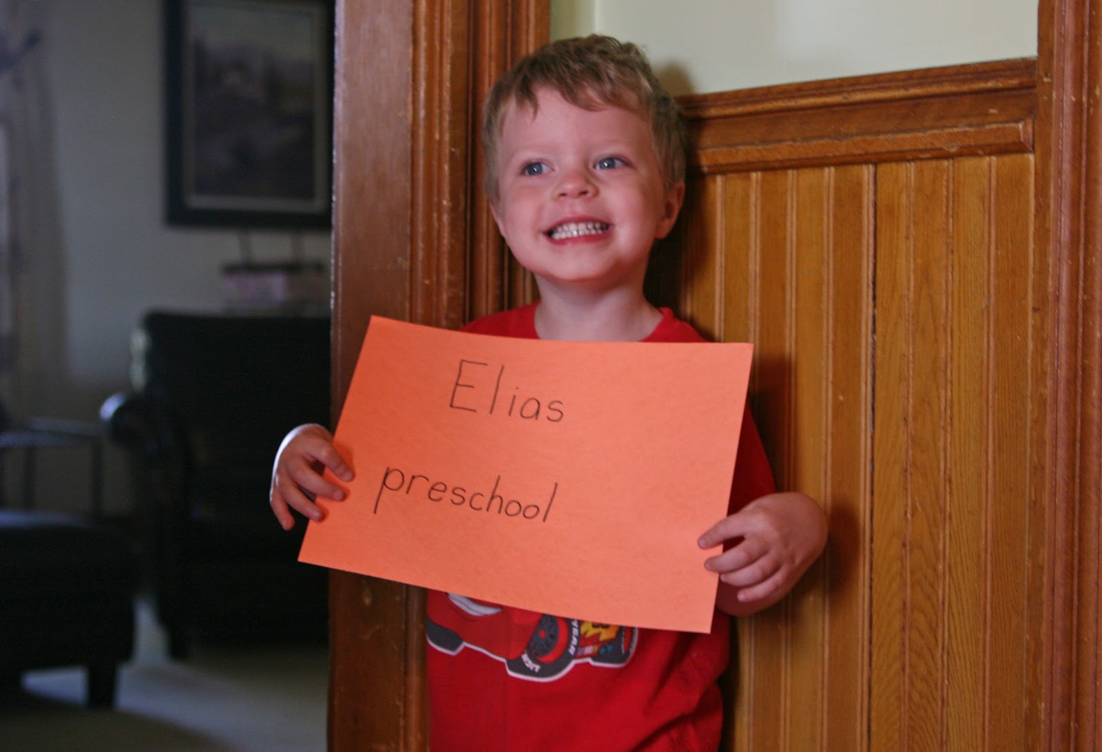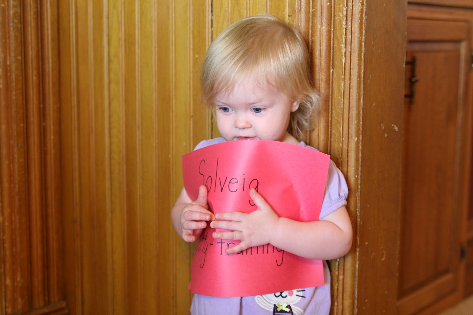 Right on cue, as soon as Elias was done with his picture, Solveig grabbed her sign, and rushed over to the corner where the other kids took their turn, and stood there very nervously. Her sign says “potty-training.” Although she may soon be ready, I just so barely got Elias to poop consistently on the potty, like last week. I might need a bit of a break before we start her. However, it would not surprise me the least if that got done pretty quickly this school year.