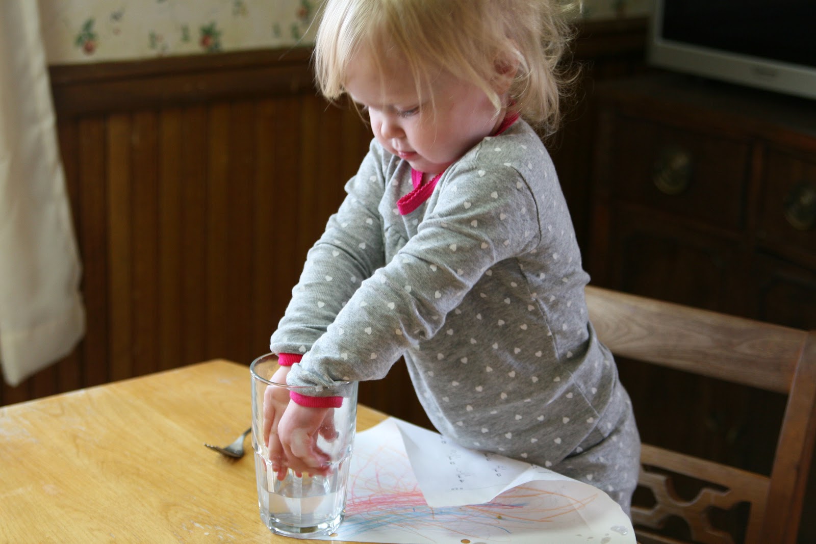 Elias has been really, really whiny this week, and that more than starting school has been making me weary. Solveig is still constantly getting into something. I’ve been trying to let her color by us, and she enjoys that. She loves playing with water, and loves to climb up to the table and pour water between everyone’s glasses. I’ve resigned myself to the fact that it doesn’t make that big of a mess, and it keeps her very happy and quiet.