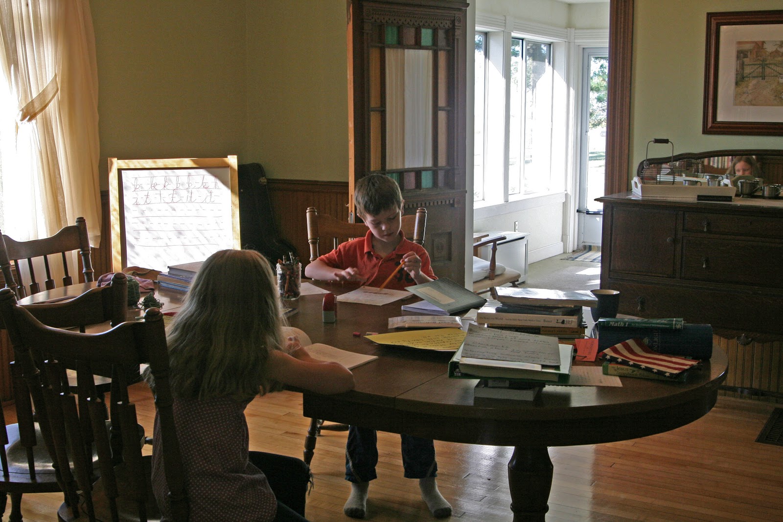 Anyway, when I saw all that I needed to get done around the house before we left, I decided not to do school that morning. Knut asked me about it because he knew what I was planning. I told him we did school off and on during the summer. David has over half his read alouds for the year already done. Both the kids are months ahead in math. Other subjects are pretty easy to cluster together in other days.
