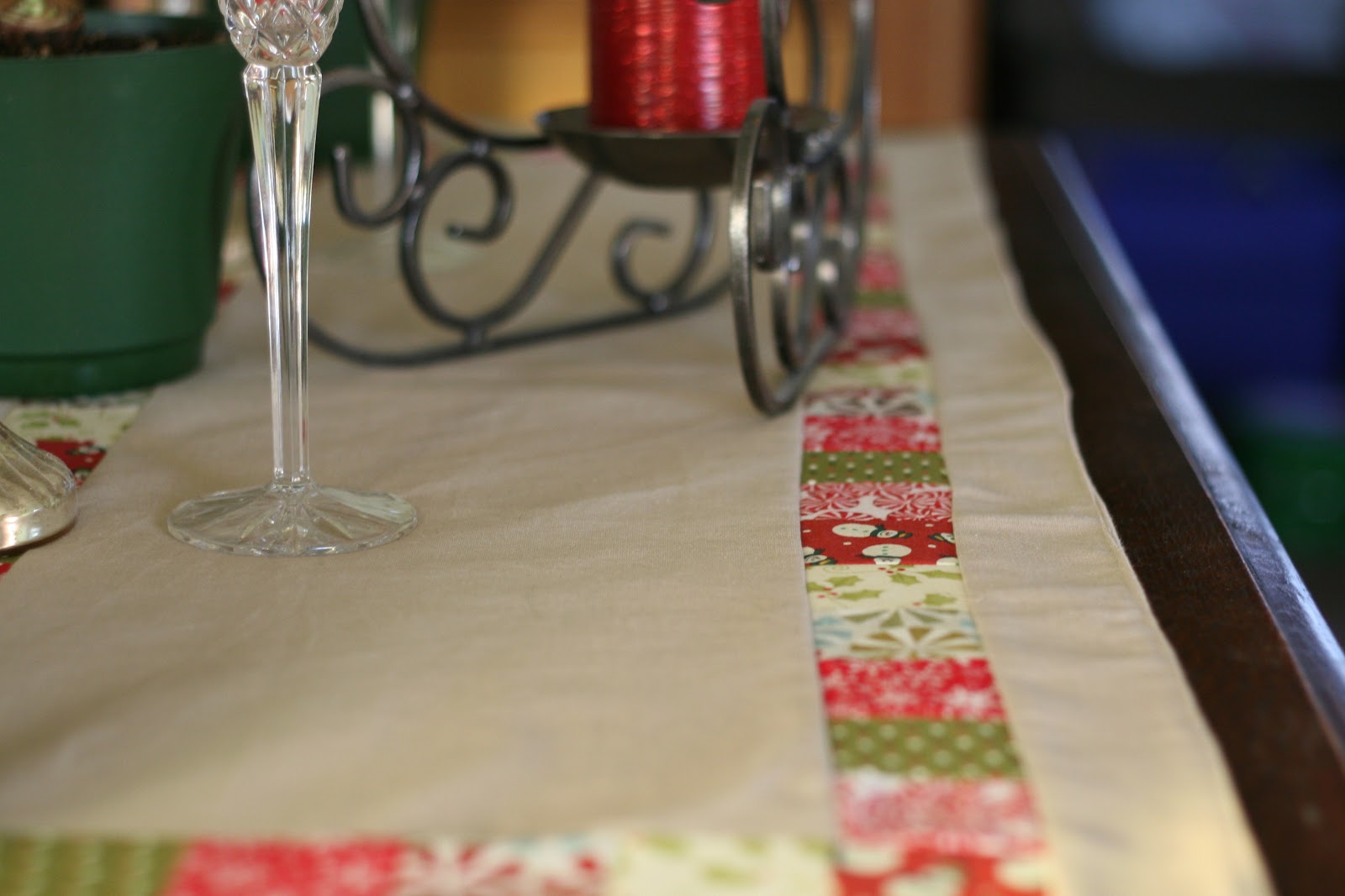 So I figured I could do something like that. With very little measuring, and using 2 1/2 inch squares, I just put this tan lightweight canvas-y type fabric with some Christmas prints I happened to have in my stash. Well, I actually picked up this tan fabric at the quilt shop a few days ago, because I didn’t have that on hand. I had one impulse buy when I was there, and that’s the green polka-dot fabric that made it into this project. There’s something about polka dot fabrics that just get me, and I have a tough time not getting them. So I just got a tiny bit. I know I said I was on a fabric buying freeze, but this fabric was used up right away, and aided in using up some stash fabric, and that’s the loophole in the spending freeze rule.