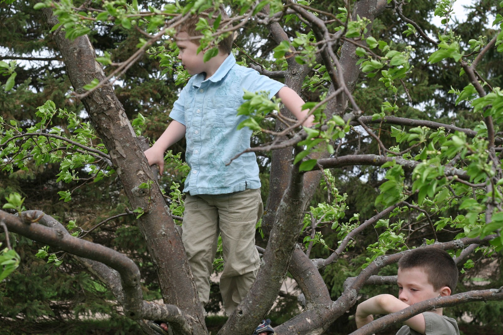 The boys had to take frequent breaks to climb in our current apple trees. We only have one small crab apple and one baking apple tree left. The crab apple tree doesn’t produce enough to make cider-making that worthwhile, so I’m glad we’ll have another ready to produce in a few years. David could live in trees, but Elias is still working on it.
