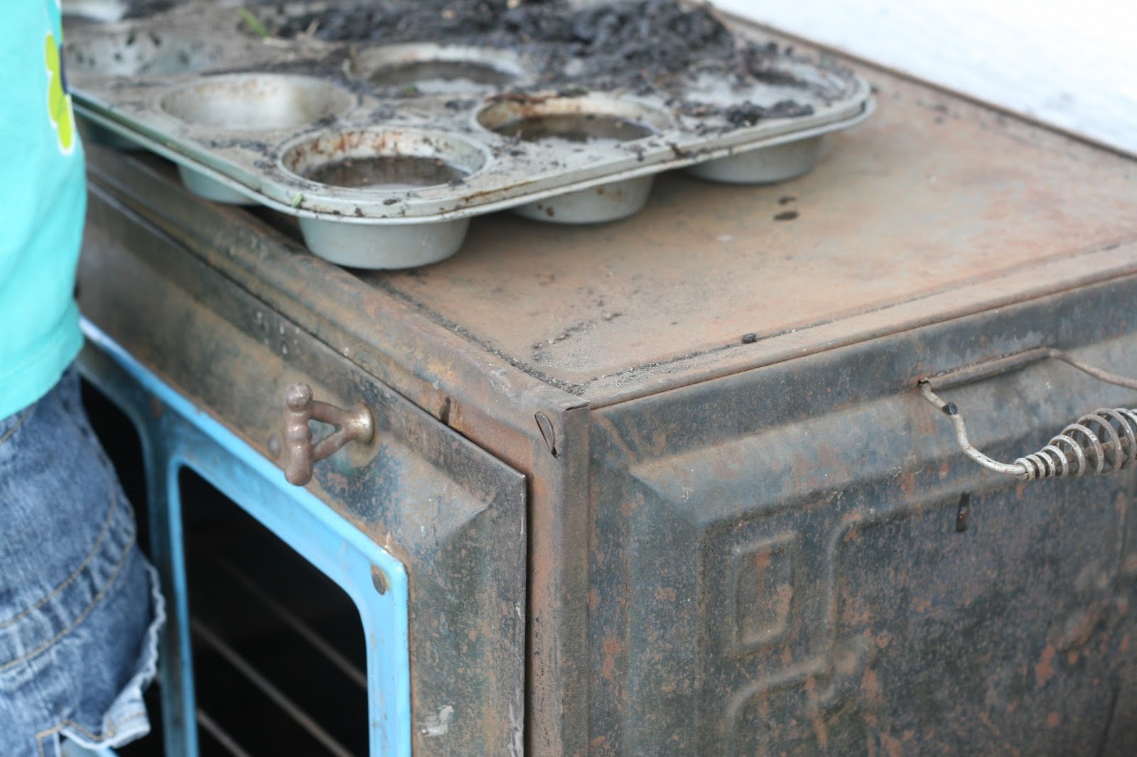 The front on it opened beautifully. It requires that you turn the heavy, smooth metal knobs at the top. I was able to get it down the ladder, with some help from the big kids. The little girls were delighted at a “real” oven to be added to their kitchen. The girls played in it for hours as I got to work in the garden, and I could see everything they were doing from that side of the summer kitchen so that was pretty fun for me too.
