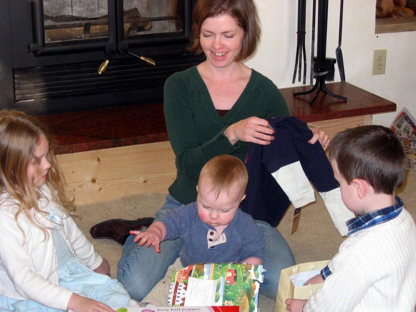 Elias is opening this one now. Yes I know you want to help but don’t touch the presents. Knut, can you help me here? Look, it’s a shirt Elias! Yes, that puppy is soft on there. Does it taste good? Now look at what Aunt Rondi and Uncle Chris got you! David back up. No, back up more. Silje, no, you cannot help. When he needs your help, I’ll tell you. OOOOooo, is this a fun toy? Yes, we’ll have to open that. David, it’s not yours. Silje, back up too. This is Elias’ toy. He gets one toy that he gets to play for a little while by himself. No, back up. Knut, do you want to get that out of the packaging for me? Here, Elias, look at this card. That’s fun, isn’t it? This tissue paper makes a funny sound, huh? David, no. Don’t touch the tissue paper. This is Elias’ tissue paper. Silje, you’re sitting nice, do you want to help him a little? No, honey, help him, don’t grab it from him.