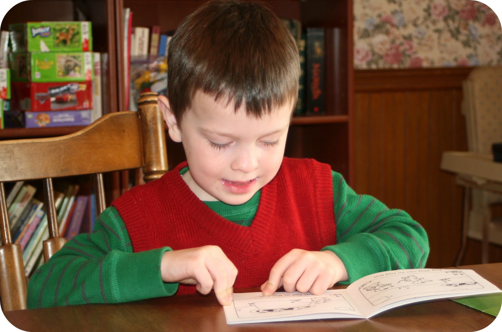 I didn’t have anything really planned for David, but I have work-boxes of things for him that I pulled out. First I brought out his level 1 (kindergarten) reading program that he zipped through at the beginning of the year. I had him read all the little books in there, which he did with great enthusiasm. Next I had him do some Mighty Mind puzzles.