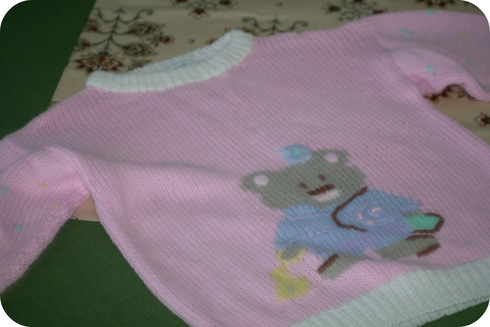 When I was a little girl, I had a sweater that I loved. It was pink with a little bear on it, and it was so soft. Eventually I outgrew it and I remember crying when my mom was pulling things together to give away. For some reason, she let me keep it. She said I could save it so that if one day I had a little girl, she could wear it.