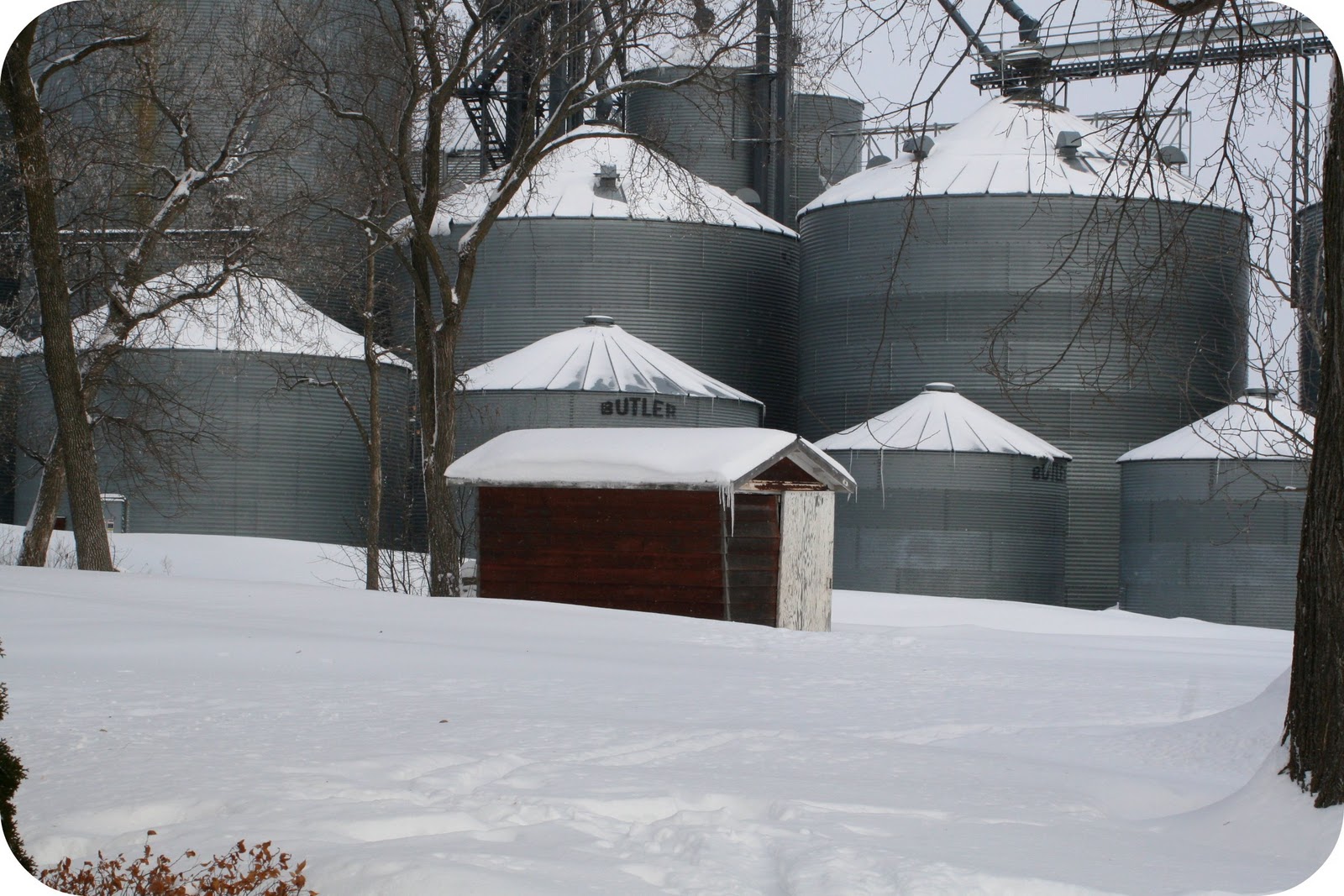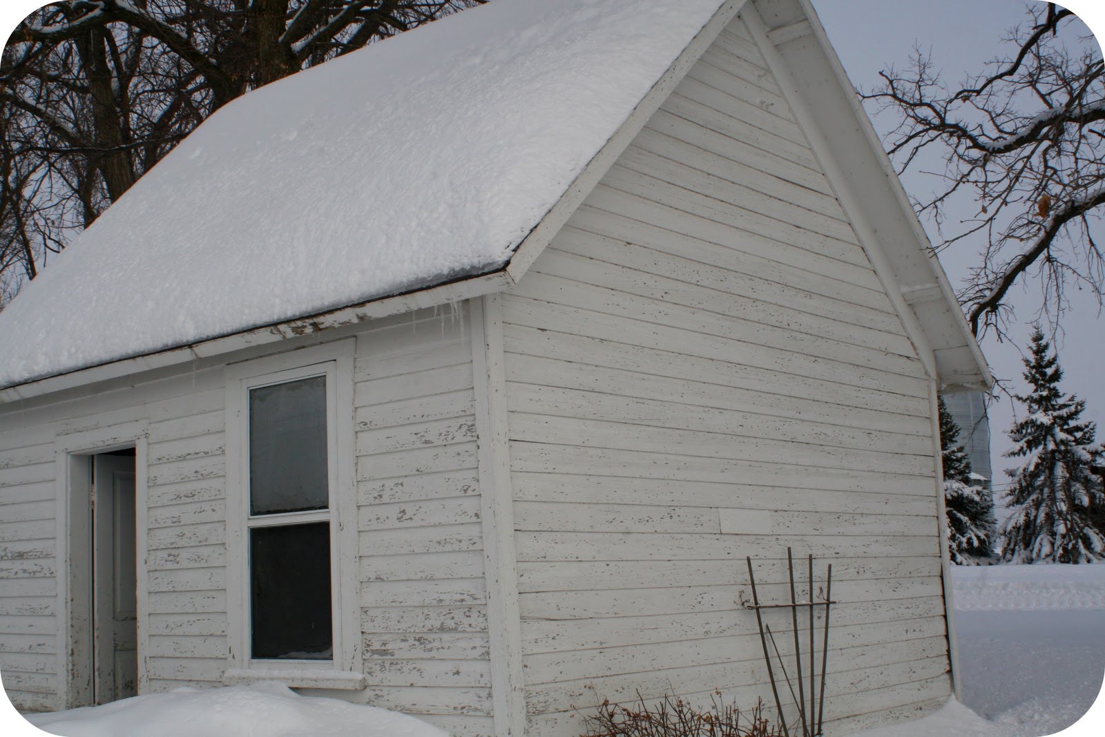 Now that you’ve seen the summer kitchen, the barn, this is actually the “shed.” At least I think that’s what it has been referred as. It’s falling apart a bit, but I still think it’s a beautiful structure. We have big plans for it this spring. Anyone care to guess (who doesn’t already know…) what special new project we will have undergoing in this pretty little shed in the shadow of these steel mountains of grain?