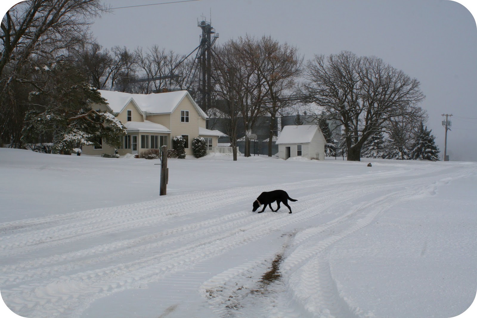 We’ve trained Lena to not go past that post, because we fear she’ll get run over by a car. It’s happened here before, though not to one of our dogs. She knows she can only accompany me past this point to the mailbox if I ask her to. Otherwise, she’ll either sit and wait, or pace back and forth until I come. She’s a pretty smart dog for the most part. She’d be even smarter if I worked with her. Lately Elias and Silje have been her trainers. We try to keep her inside more when semi-trucks are using our driveway around the clock during harvest time.