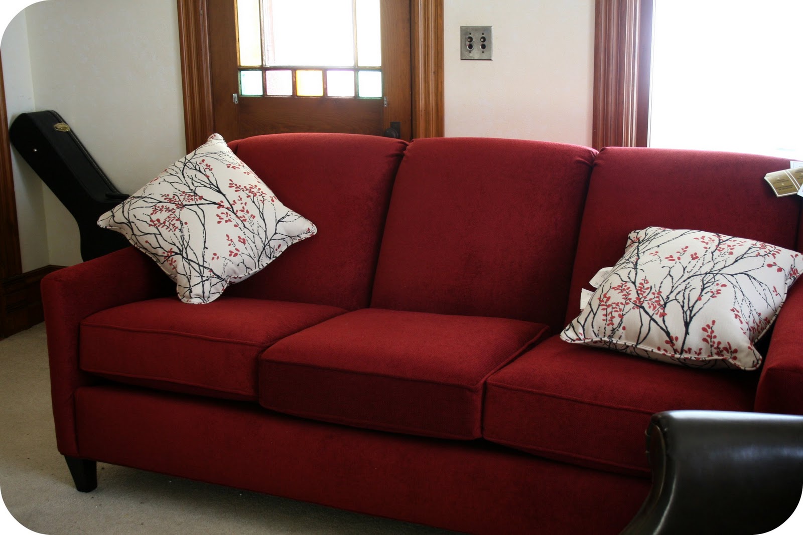 Pardon the tags and disheveled pillows. It’s a busy day. I know a red couch may not be the most sensible. I’m so sick of beige everything. Knut and I had a chuckle when we went to the first furniture store and met an old salesman at the door. He asked what we were looking for. We said a couch. He asked if we had a color in mind. Yes, we wanted red. “Don’t have ’em. Sorry.”
