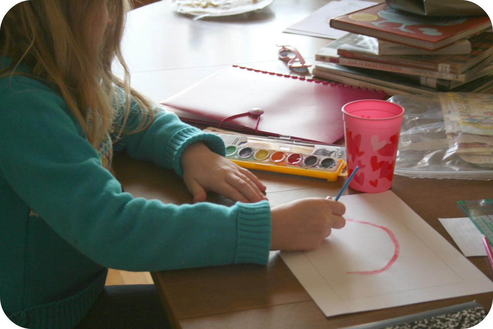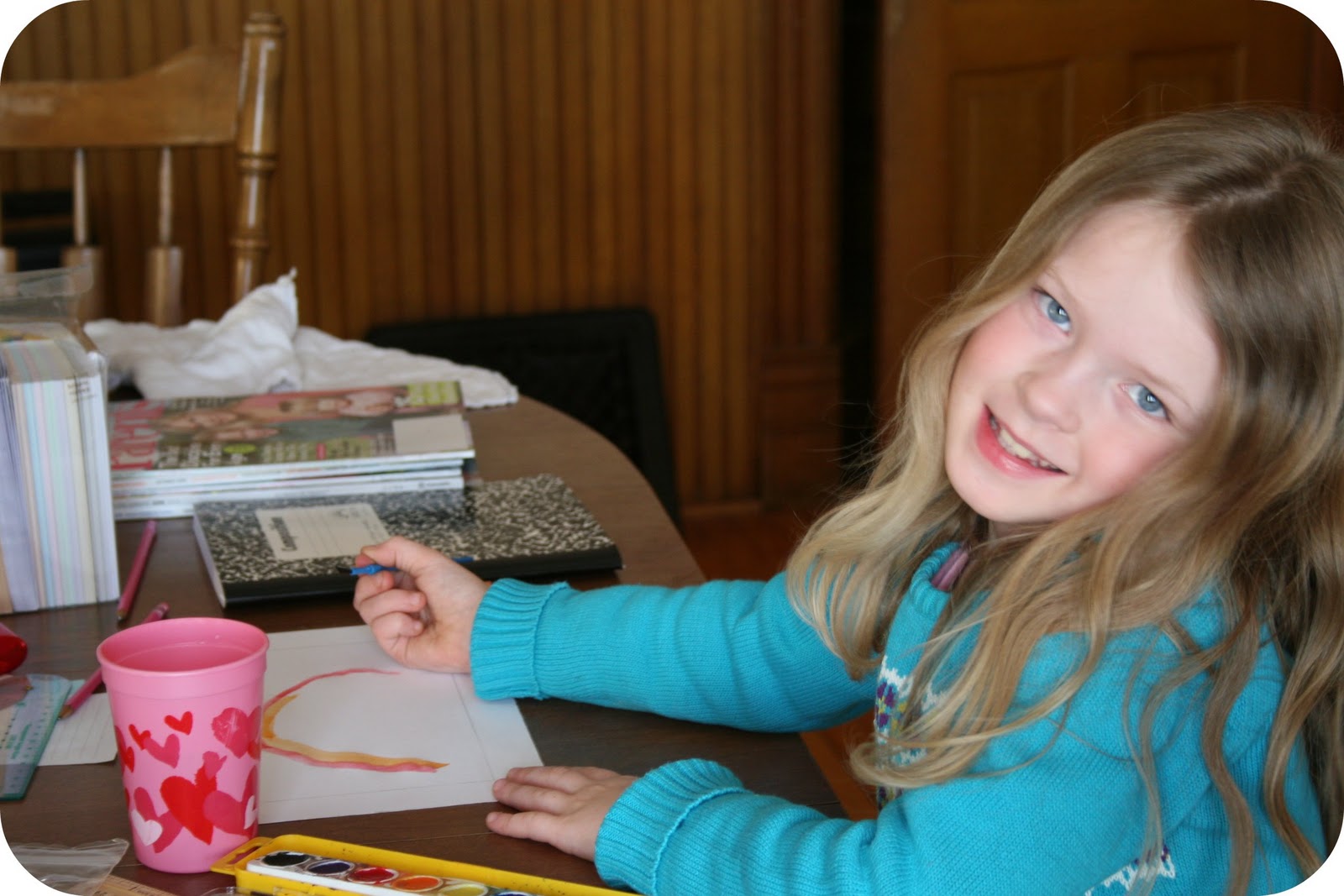 The first assignment that the Miss Agnes gives is to make a painting. She gave each of the children a piece of paper and said they must not let once space of it go without color. It must have color on every inch. So after we read that, I suggested that we bring out the paints, and Silje should do that assignment too. Silje nearly fainted from surprise. Mommy? Offering to bring out the paints without me begging asking? So of course she took me up on it, and made a picture of a rainbow…and a snowman.