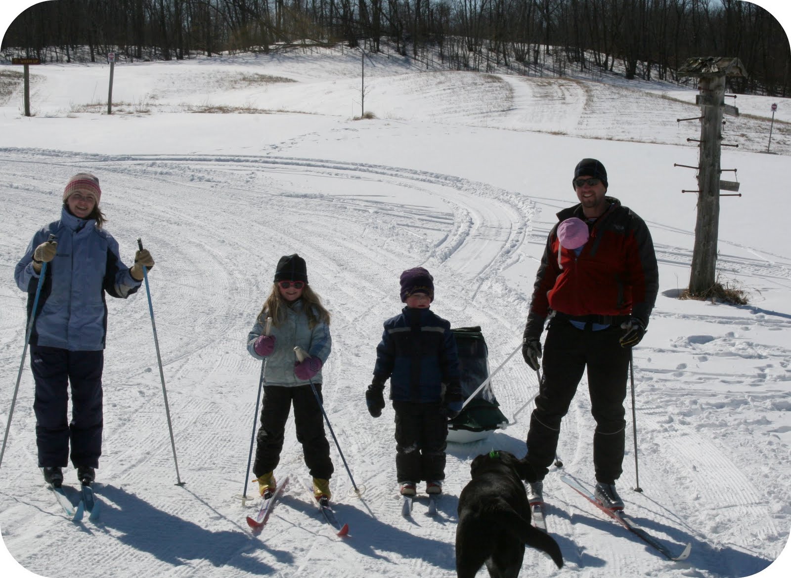 As you can see, Silje and David were on their own skis, although David asked me to hold his poles half way through the first trail because he thought they were getting in his way. He does much better without them, as most kids do. Elias was in the pulk, zipped in and pulled by Knut. Although he loves being on skis, he’s not quite up to going out on trails yet, and more plays with Daddy in the yard there. He loves being pulled by Knut though, and we often hear his squeals of delight. Knut also had Solveig in the Ergo carrier under his jacket. She however, got bored and fell asleep. Bob, the black lab that lives at the ski farm, joined us on the trails as we seemed to be the only ones out there in the morning.