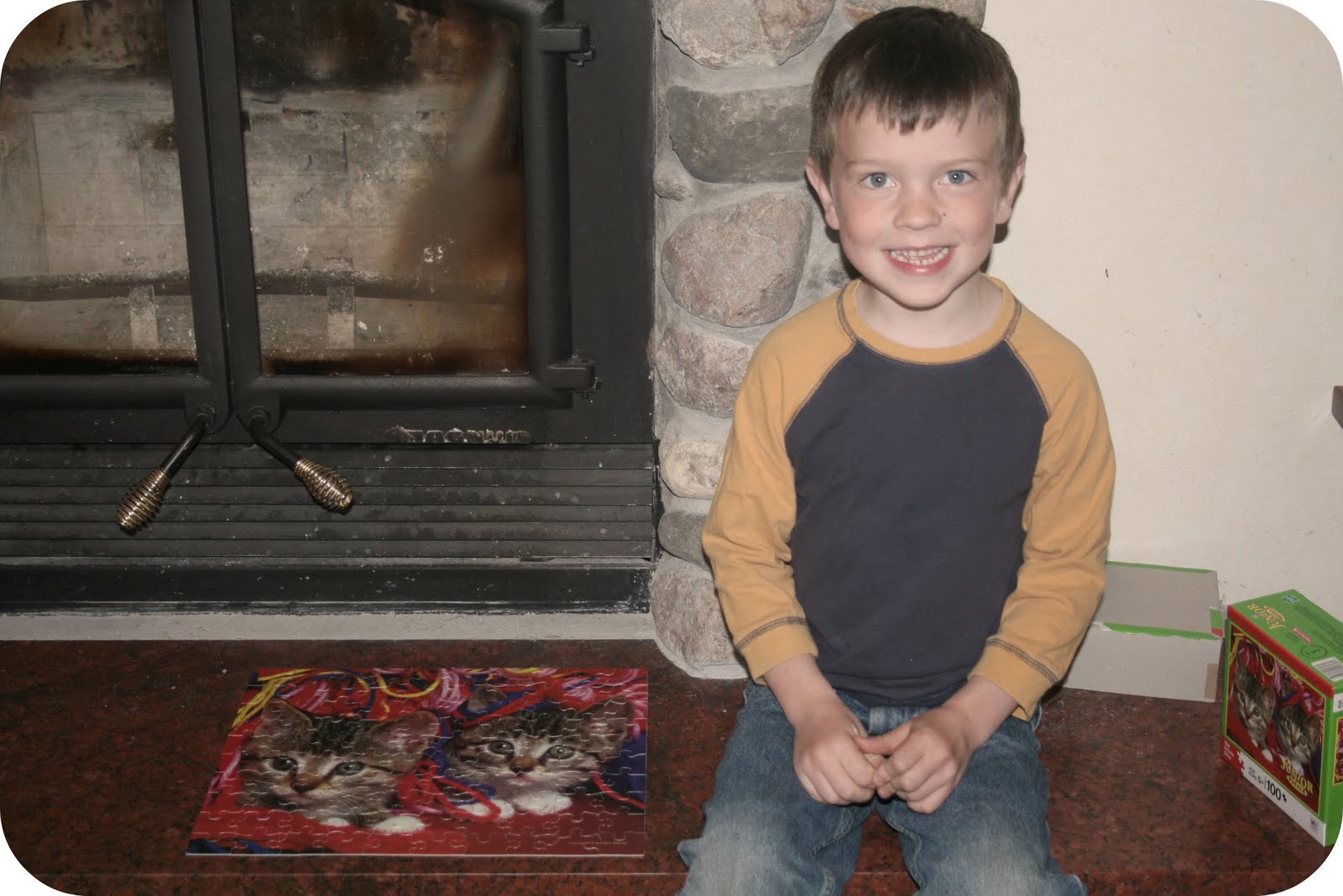 This morning they actually kept busy with puzzles. I’ve separated them to work in different rooms so I don’t have to break up an argument while Solveig naps. David was very happy to finish a 100 piece puzzle, which I’m not sure he’s done on his own before. He wanted me to take a picture.