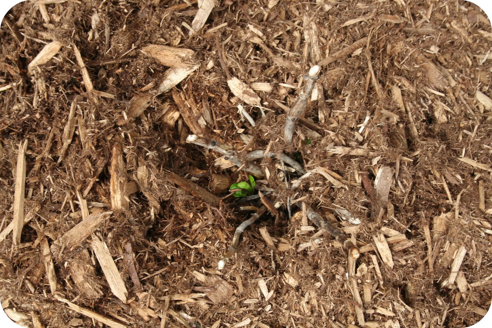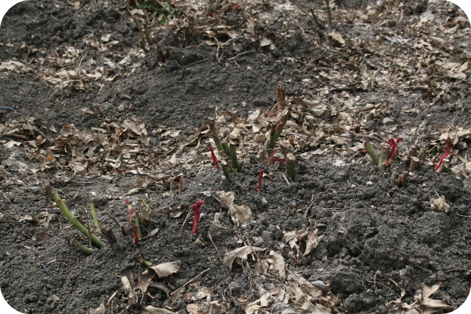 The roses which were cut low and covered with dried leaves are now uncovered and showing a bit of life.
