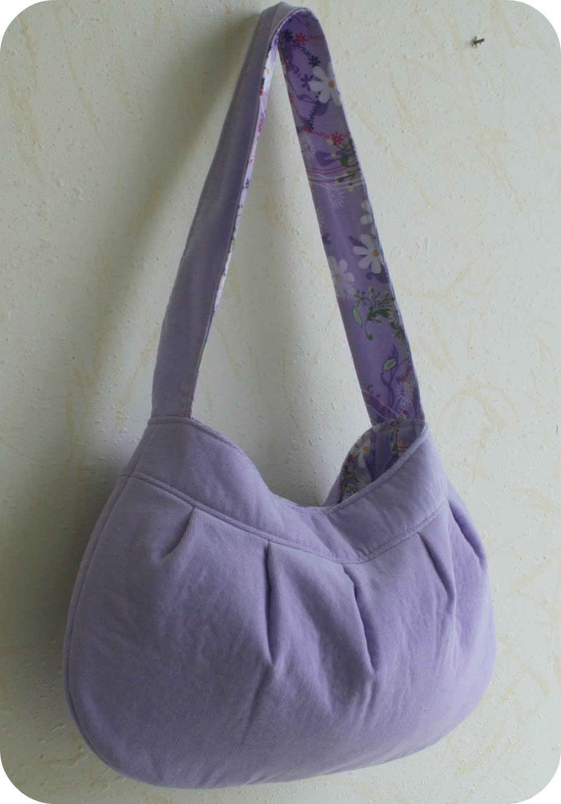 It’s a lavender buttercup bag in the regular, small size. I like this size purse to carry all of “my” things in, and I can easily tuck it into a diaper bag and my wallet and sunglasses don’t have to float around in the big bag. The outside of it is baby corduroy, and the inside is a pretty floral cotton. I was planning to make it for my store, but when it was all said and done, I realized that I forgot to put interfacing in the strap. The pattern has interfacing for the strap as optional, but still I like to be consistent in what I’m making. (For those who do not sew, this means that the strap isn’t as stiff as the ones I sell.) Since it’s not consistent with the bags I usually sell, I thought I’d give it away. It’s still really pretty, but I figured I’d have full disclosure there!