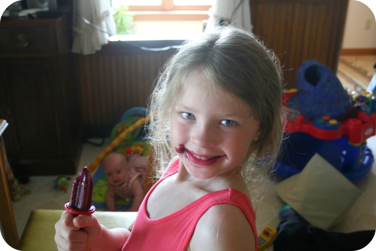 Our second recipe that we tried was “Blackberry Swirl” which is a bit more tame with yogurt, blackberries, and again, banana. Since we all didn’t like how overwhelming the banana flavor was in the other pop, I cut what she recommended for this ingredient in half, but I still think it doesn’t need it. The kids really liked them, but Silje didn’t like the seeds. Ironic, because she snacked on all of the leftover blackberries without complaint, but didn’t like the seeds in the ice pops.