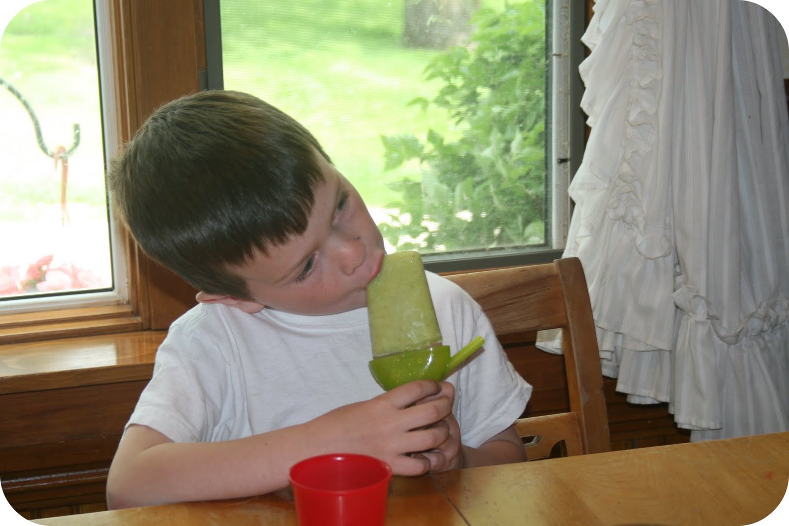 We started out using one of the most intimidating recipes in the book: “The Green Machine.” In it is pineapple, banana, water, spinach, and flax seed. I know…I lost you all at spinach. It was such a small ingredient compared to the rest, though, and basically only colored the things. The flax seed wasn’t tasted at all either. In fact, all it really tasted like was banana. The banana flavor was terribly overpowering, but the kids still liked it. Well, they didn’t like the amount I gave them. The recipe filled 2 sets of molds…both a large and small one, and then some for smoothies. I gave the kids the large mold pops and they had trouble finishing them, but they quickly asked for the smaller shaped molds for snack time the very next day.