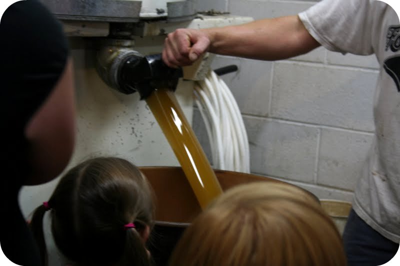 I took pictures so David could see honey shoot out into big barrels. When the barrels are full, they weigh 700 lbs. Cool, huh?