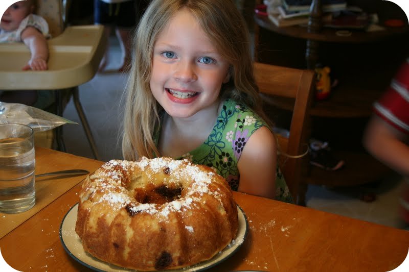 Here is her cake. We had friends over so I had to get it out of the pan and it stuck just a bit. I can’t for the life of me find my mesh sifter for the sugar on top but I did that for Silje since she was busy playing with our dessert guests.