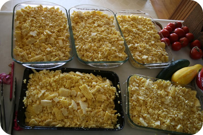 Husking an insane amount of corn and slicing off all the kernels is a job, so we kind of have a party of it. Knut’s parents and his sister and family, as well as his grandma come over for the morning. Linda, my mother in law, is often the one who cuts the raw husked corn into 9×13 pans. We fill them up pretty good. At this point with what my family eats, I make 5 pans for the year’s supply.
