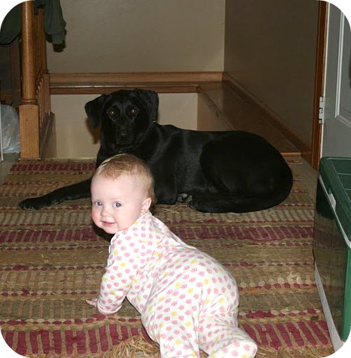 I mentioned how much she likes Lena, but I have a photograph showing how much Lena loves her. I was taking pictures of her as she was crawling around. We were in the kitchen and I had not closed our makeshift gate leading to the back hallway which has stairs to the basement. Normally she can’t get back here, but since I was standing right there, I thought I’d see what she would do.