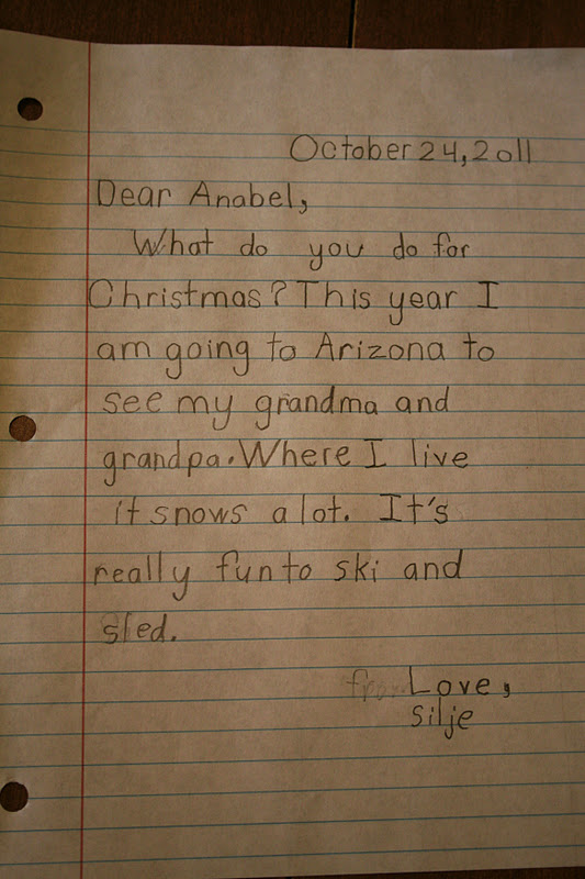 It happened Monday morning. Well, I should back up to the previous Saturday. Silje got a letter in the mail from the little girl we have contact with in Peru. She wanted to write back right away, so she took a piece of computer paper, and started at it.