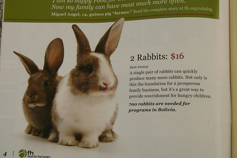 We got in the mail a gift giving catalog from Food for the Hungry, a charity that my mom works for. Knut and I have a huge respect for them. Just ask either one of us and we’ll talk your ear off about how they don’t just give things to the poor, but they allow the poor to maintain their dignity. We’ll tell you how careful we have seen them use donations, and how they come up with programs that are smart. They deal with both emergency situations, and community development. I love hearing about their community development programs because they’re so careful to make sure that the community they serve does not become dependent on them. (I told my mom I was probably going to blog about it so she told me to put a link to their Facebook page.)