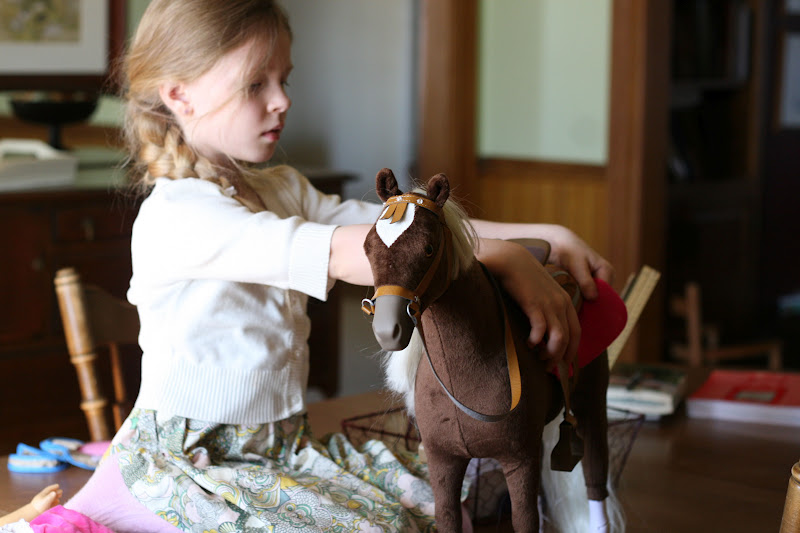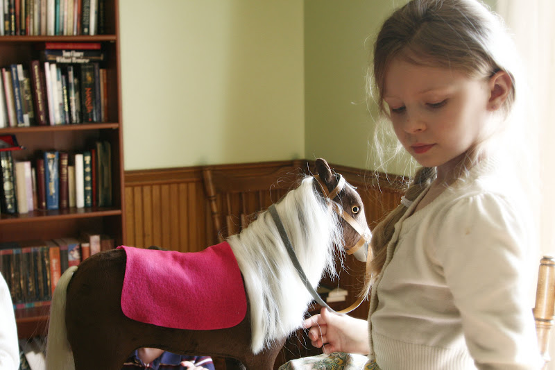Silje has been saving since her birthday (last June) for a horse for her Felicity doll. She had to buy it herself and so after looking at the ones from the American Girl company, and then the ones at Target and the ones at Walmart, she decided to save for the one at Walmart, even though it was not her first choice in color. We even kept a sharp eye out for one at the Children’s consignment shop in the city. She would have preferred a copper colored horse like Felicity actually had in the book. She has named her horse “Chocolate.”