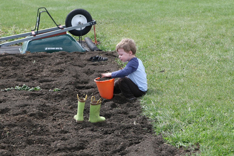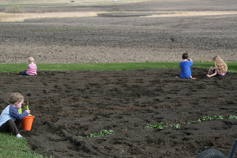 Knut finally tilled the whole garden for me. He tills deep, and afterwards it’s a big pit of soft, dark soil. I had to keep working on the strawberries, and of course the kids wanted to come with. So they took off the shoes and ran across the soil that they sank into many inches with each step. They built dirt castles. They ran leaping races. The above picture you’ll see what I saw for a few hours as I dug up the strawberry plants. (That row is spinach that just started coming up this year. I guess I accidentally let some go to seed last year. O well, head start with spinach.) Knut moved it into a row as he was tilling.