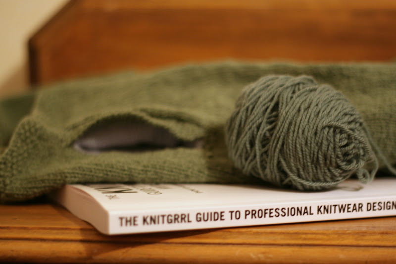 During bath time, I’ve been paging through a new “must have” book that several designers have recommended to me, and it’s The Knitgrrl Guide to Professional Knitwear Design. It does not have anything in there about how to design, but more how the design business works. It has chapters on contracts, and what is usually negotiable. It talks about various ways to make money, and interviews 30 professional designers, their take on the industry, and what percentage of their income comes from books vs. teaching vs. publishing, etc.