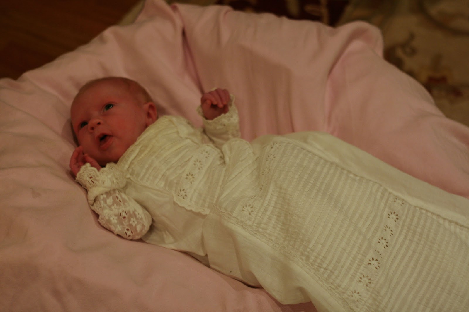 We happened to have communion not long after the baptism, and the kids were climbing on Ingrid and I and I was getting nervous about the gown, so I promptly changed her during the service before I stained or ripped it. Unfortunately, Ingrid and I got one new small tear near a cuff when changing, thought my mother in law said it’s not the first time she’s had to repair a tear like that. These gowns are getting so thin. Later that night, we put her back in it for pictures.