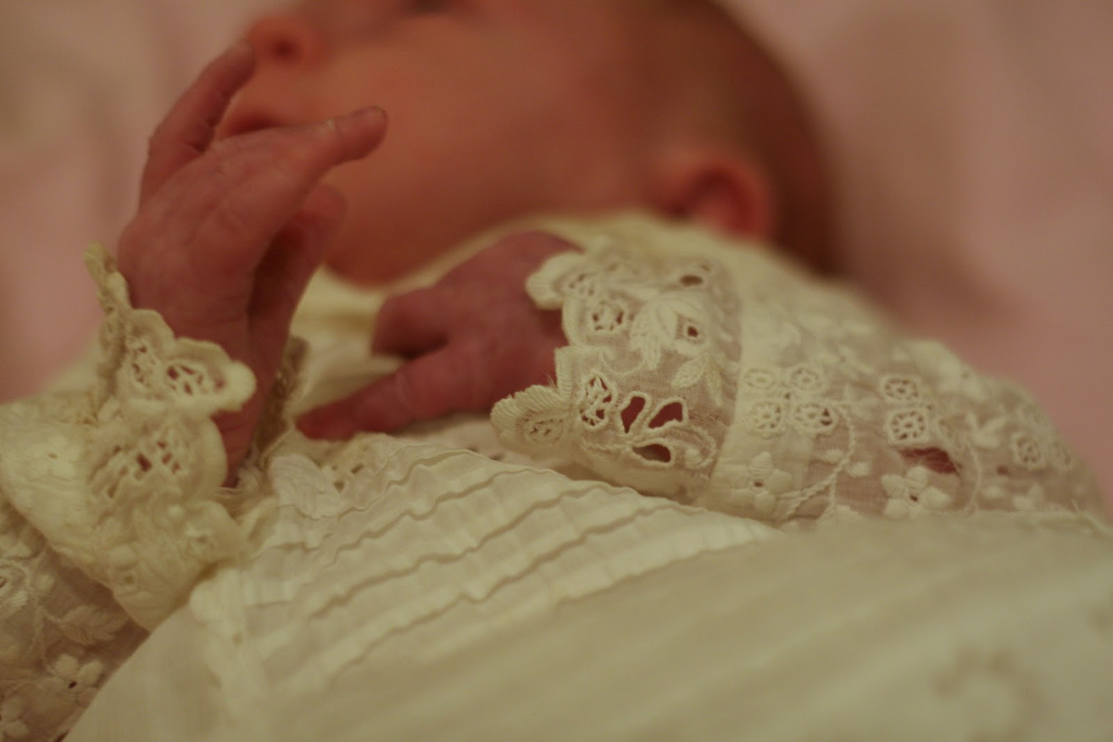 There are 2 antique baptismal gowns used in Knut’s family, and we’ve always used one for the boys, and one for the girls. One of the gowns was passed down through his mom’s side, and one was passed down through his dad’s side. This is the one from his mom’s side. It’s at least 130 years old.