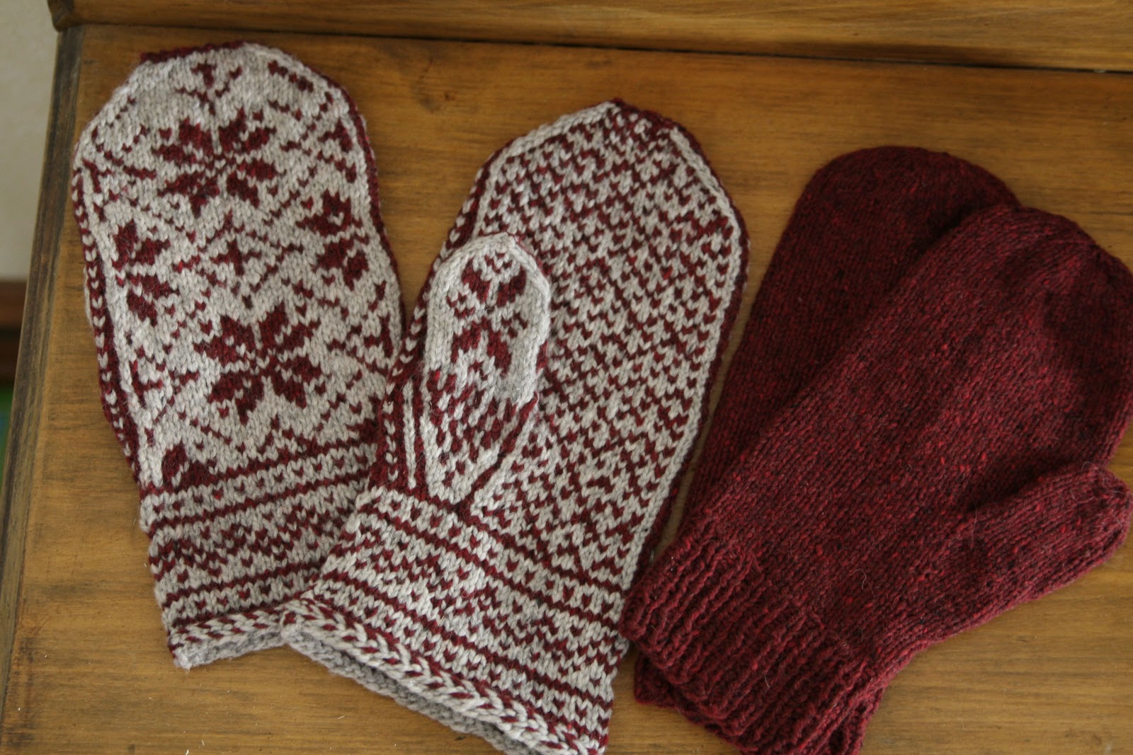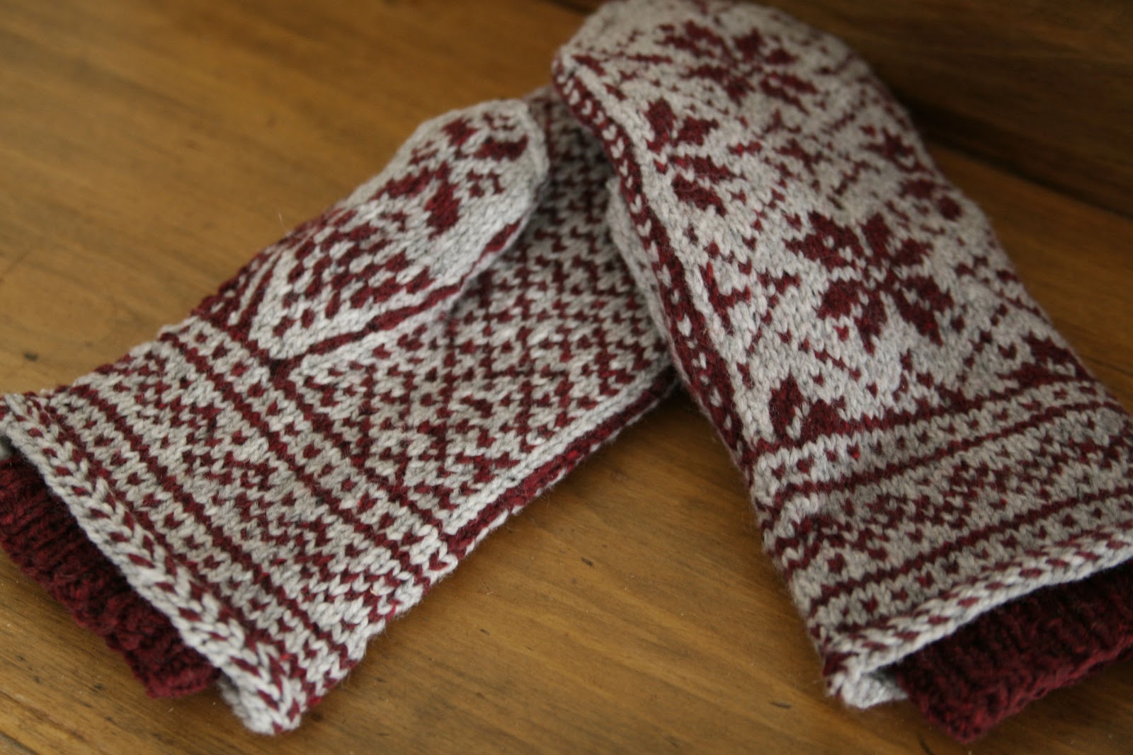 I love this pattern, and have made it a few times. In fact, I’m wanting a pair for myself now. Although I would follow the pattern exactly. Because it’s a good pattern. However, for Knut’s mittens, there were several modifications to the pattern. He picked a pointy pattern, and then asked me to make it less pointy. So after doing lots of planning on paper, I made it less pointy. I ended up knitting the main portion longer, making the decrease section shorter, and then cast off the main pattern stitches leaving the 3 dark red side stitches on either end, and then took the edge portions of dark red and knit those further, to line the top edge, kitchener stitched them together to form a loop over the top edge, and then sewed the top edge down to the patterned cast off stitches so that the pattern flows more seamlessly.