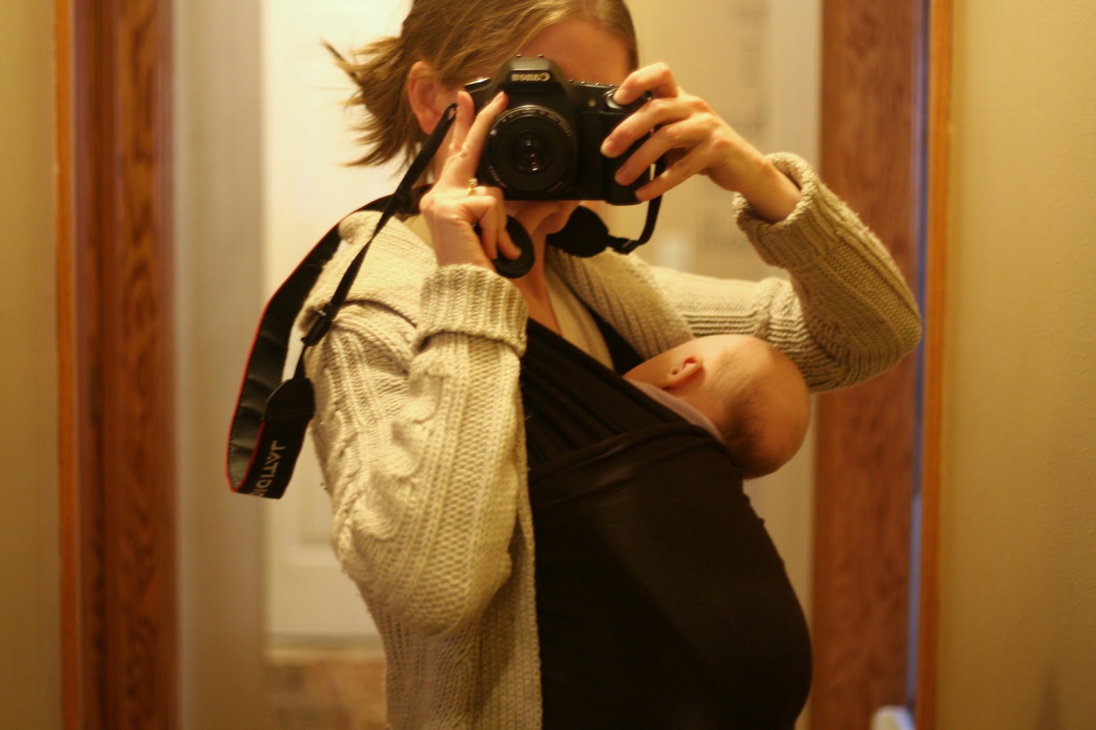 Self-portrait. Ingrid’s head isn’t hanging as much as it appears. Her chin was leaning against my chest. This is me most days. Moby wrap and a baby over sweats, with a cozy wool sweater thrown on top, and my hair in a messy pony tail. I love baby-wearing. No one can see how big your belly still is. They just see baby.
