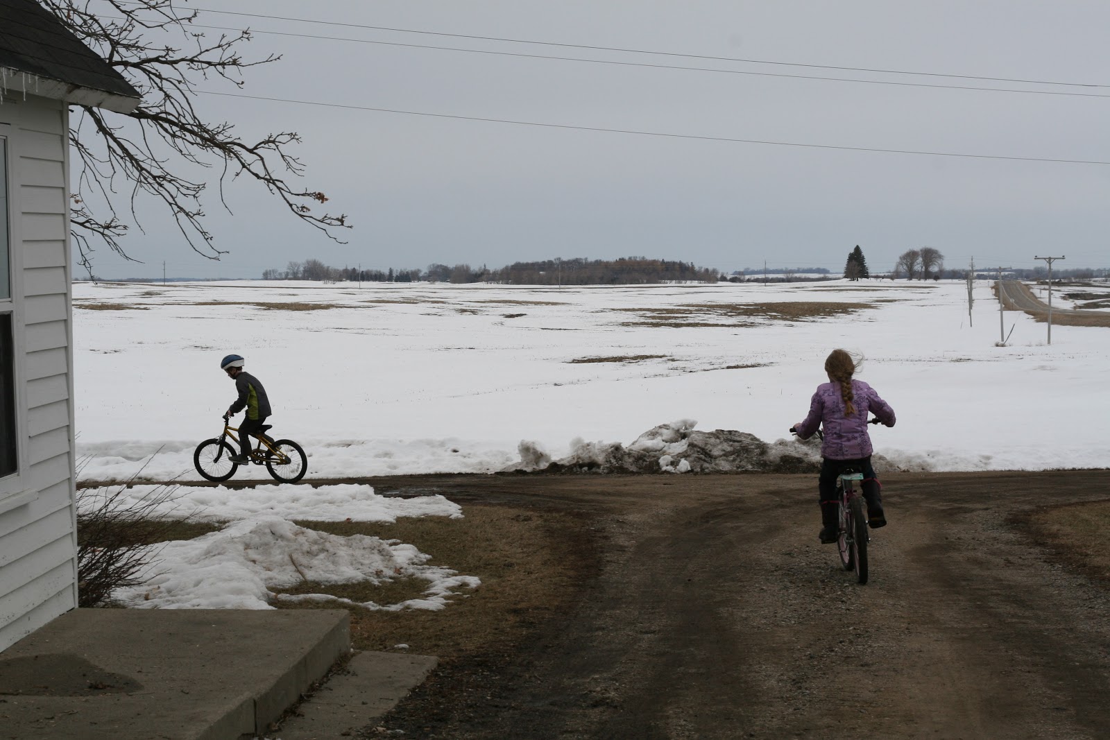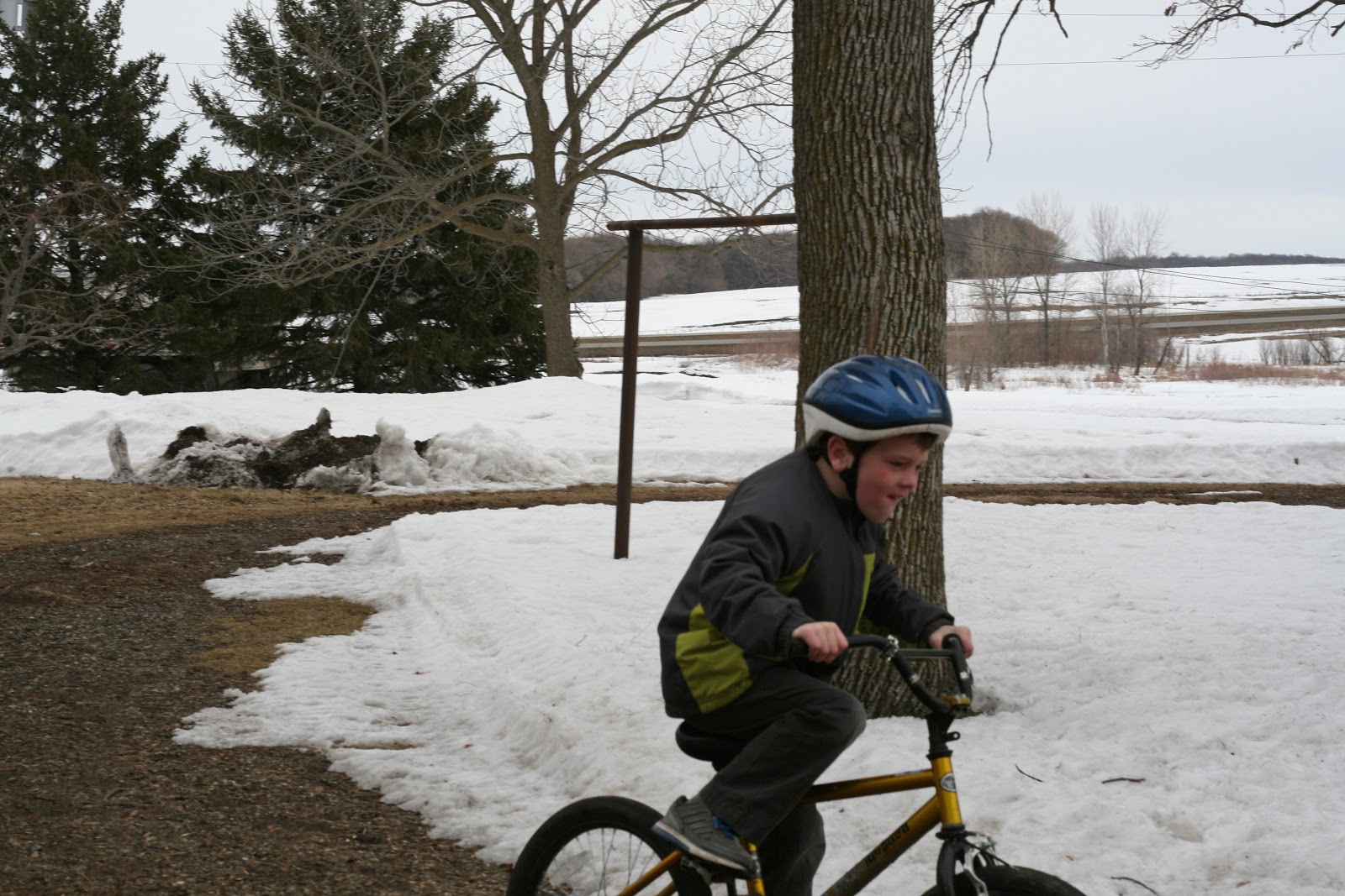 The temperature is rising above 30 degrees around here, so that must mean Spring is upon us. The kids love this “outdoor” sort of weather, and since our driveway has cleared of most of the slush and ice, they wasted no time bringing out the bikes.