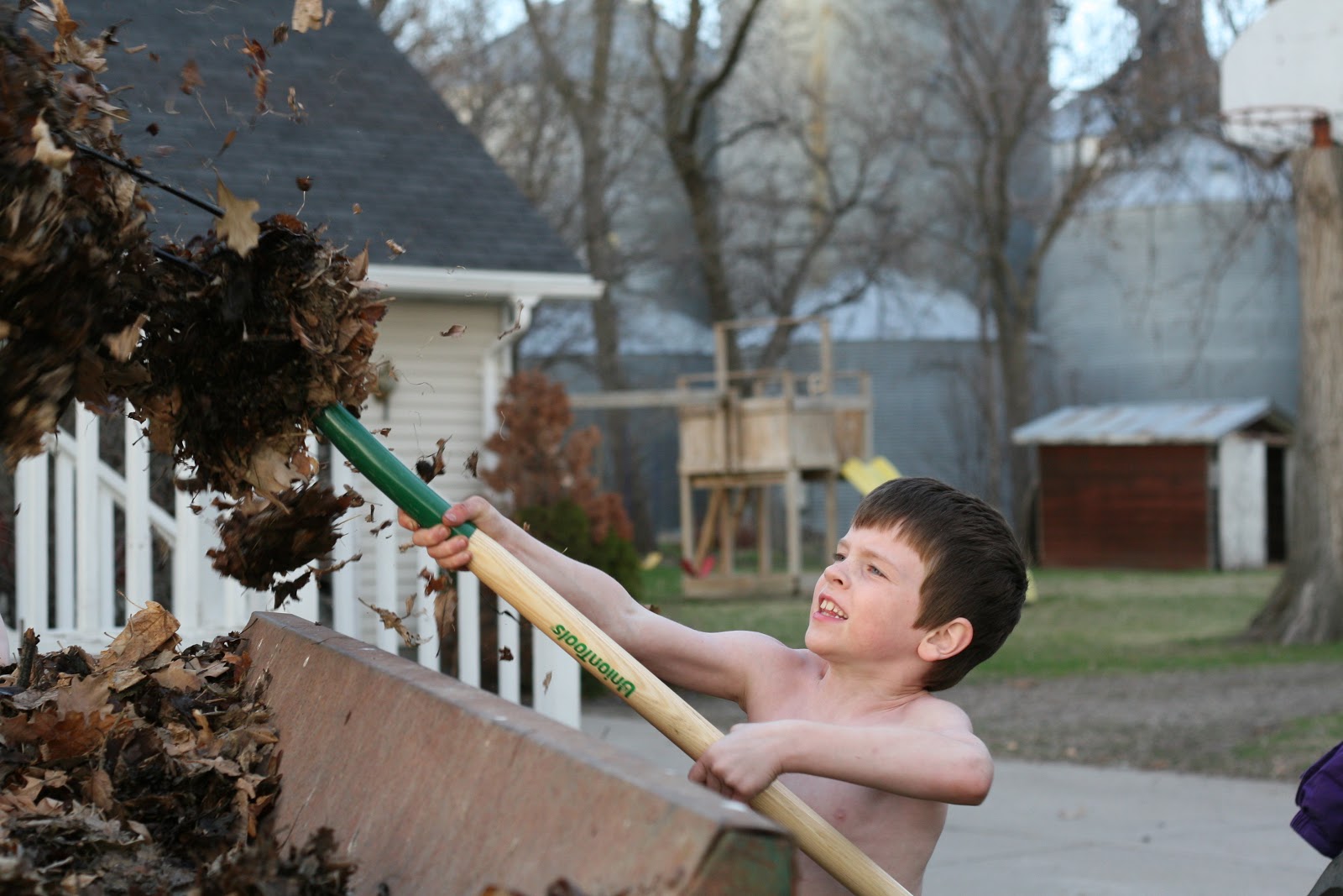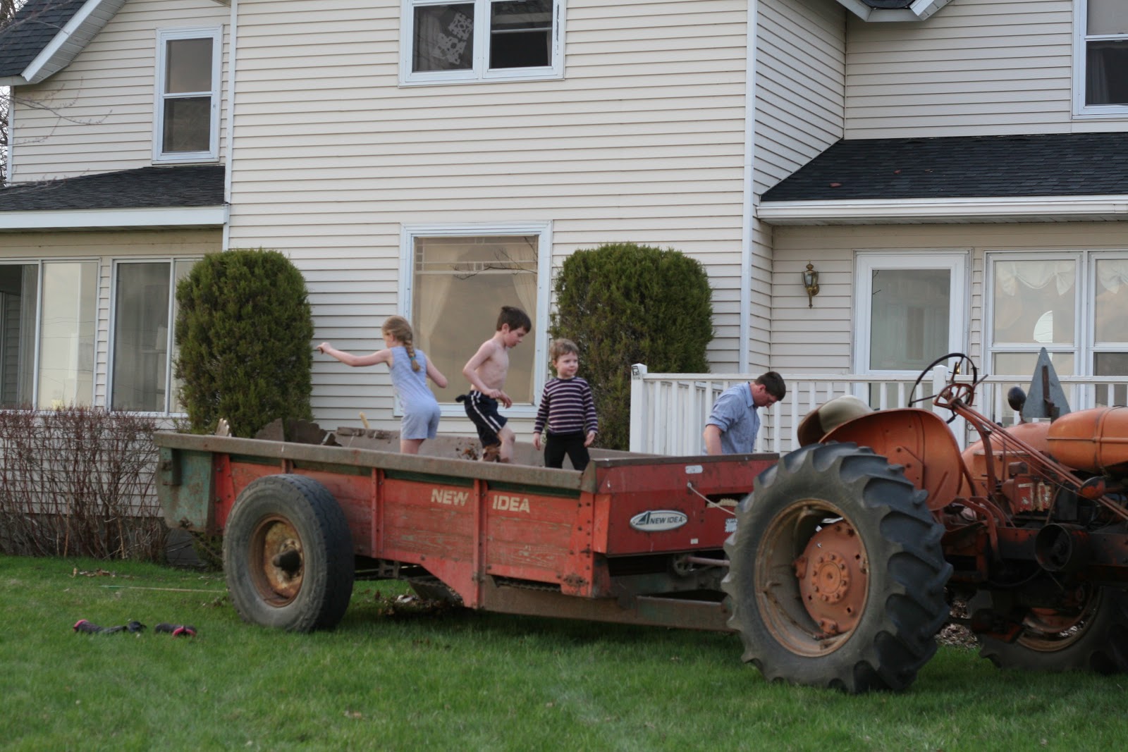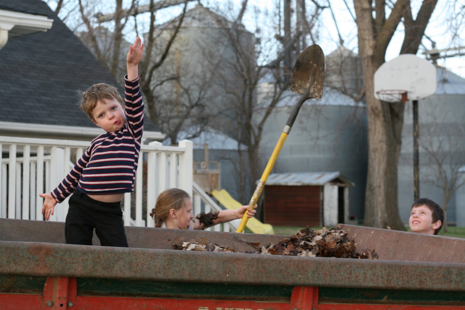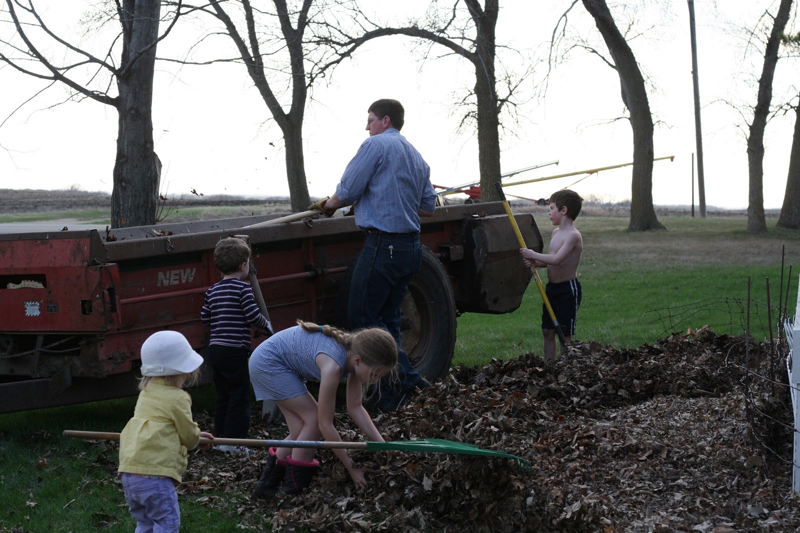 We were playing in the fine weather, and then Knut got home, and he called all the kids to come out and help. We had to load all of the leaves into the old manure spreader. We all helped, and then Knut took us all on a ride across the street to our field to “dispose” of our old leaves.