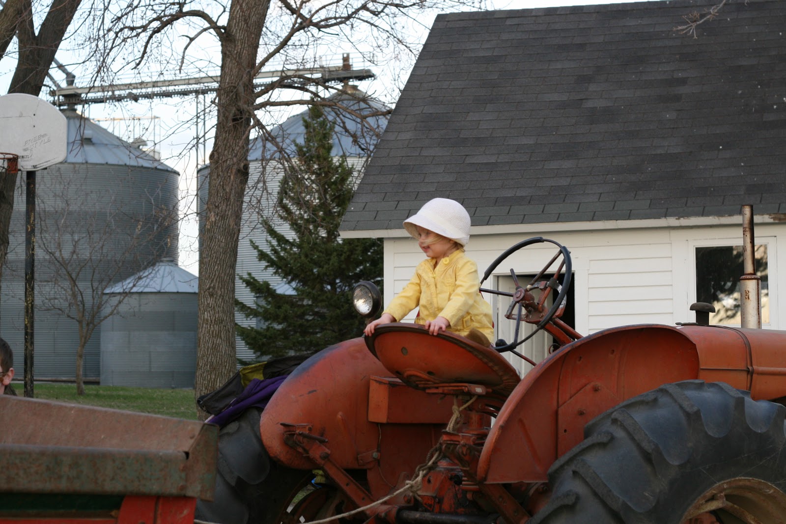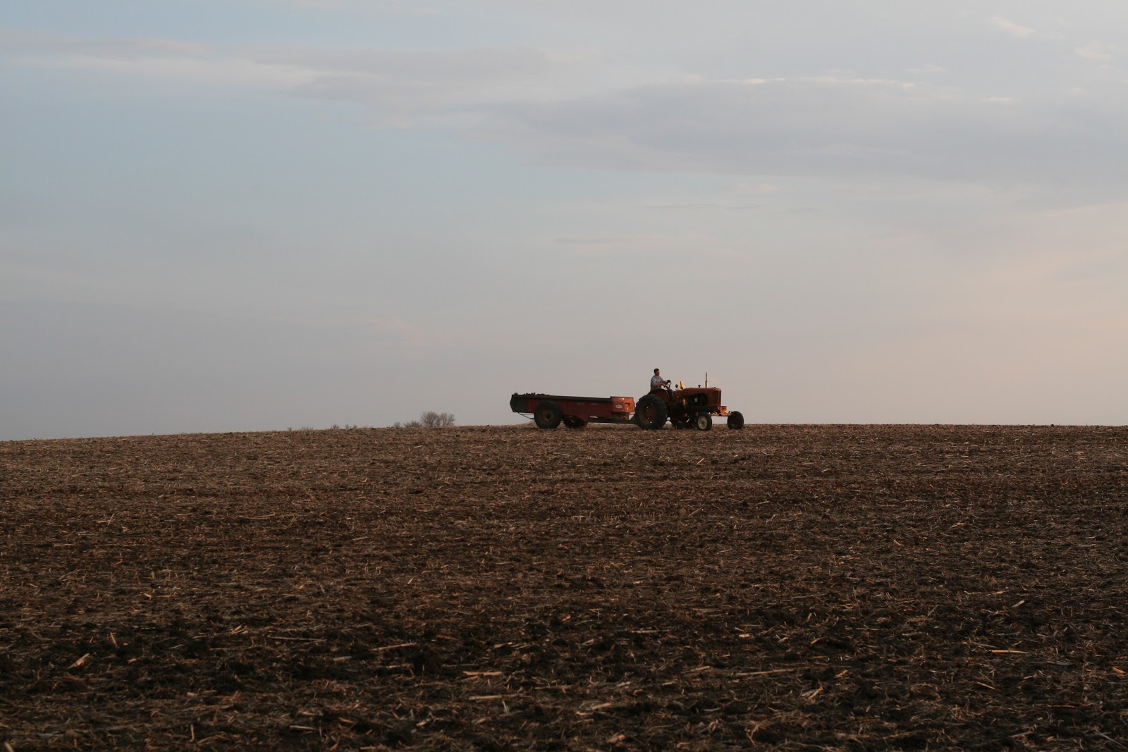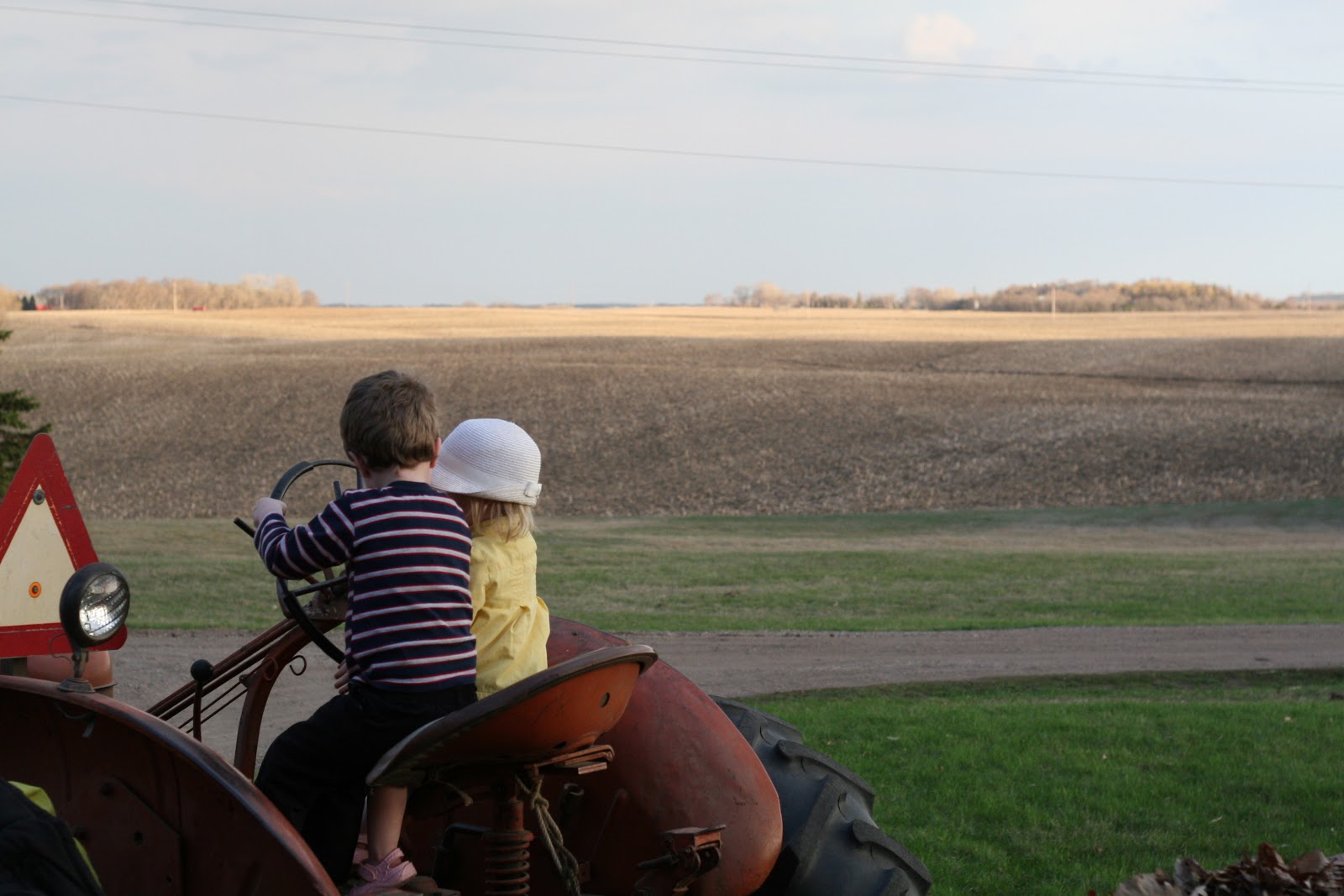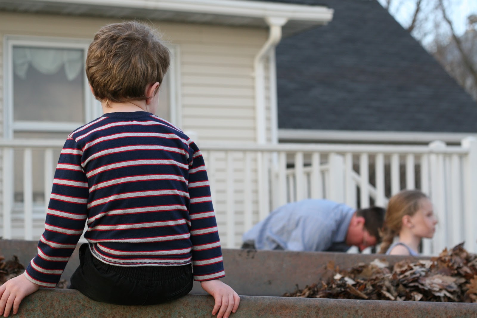 We were playing in the fine weather, and then Knut got home, and he called all the kids to come out and help. We had to load all of the leaves into the old manure spreader. We all helped, and then Knut took us all on a ride across the street to our field to “dispose” of our old leaves.