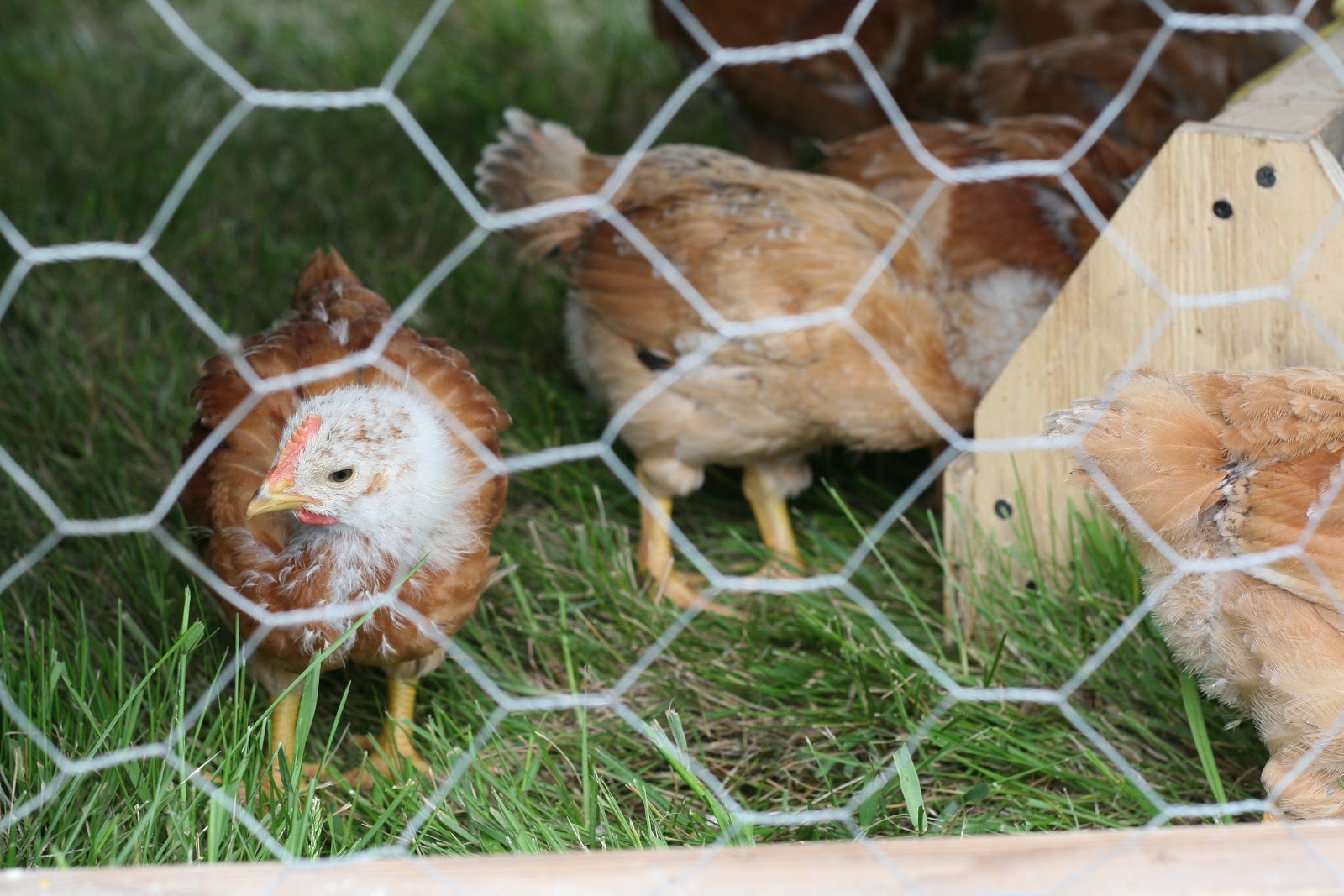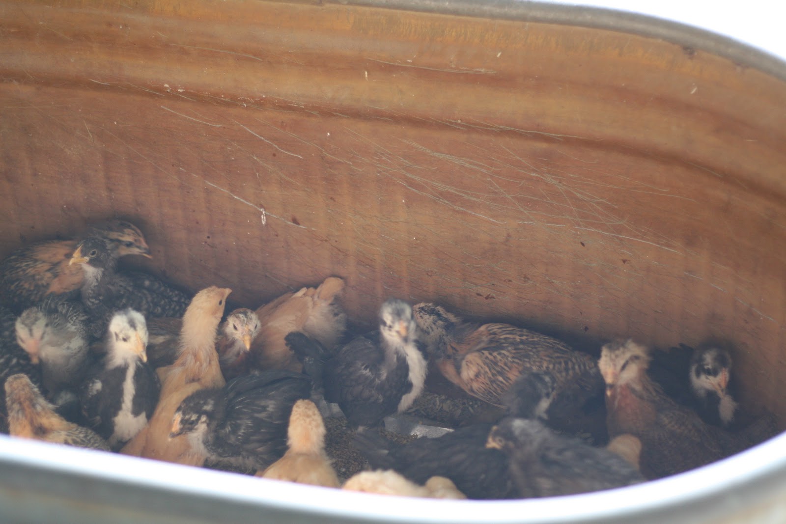 They got moved over to the sunshine (the netting on top was put back on after the picture. They can almost hop out now), and still in the old horse’s watering trough. They’ll be moved to the coop today. These girls will be free range over the yard in a little while. They’re still too small. They’re much smaller than the meat chickens, and still too prone to predators. The coop will provide them more room, though, as they are fast outgrowing this brooder. It will be good to get them all settled into what will be their home. They won’t be allowed outside the coop until they’re just a bit bigger. So there’ll be some coop cleaning and set up today. Fresh bedding laid, fresh food set out, and perhaps some bug filled greens to whet their appetite.