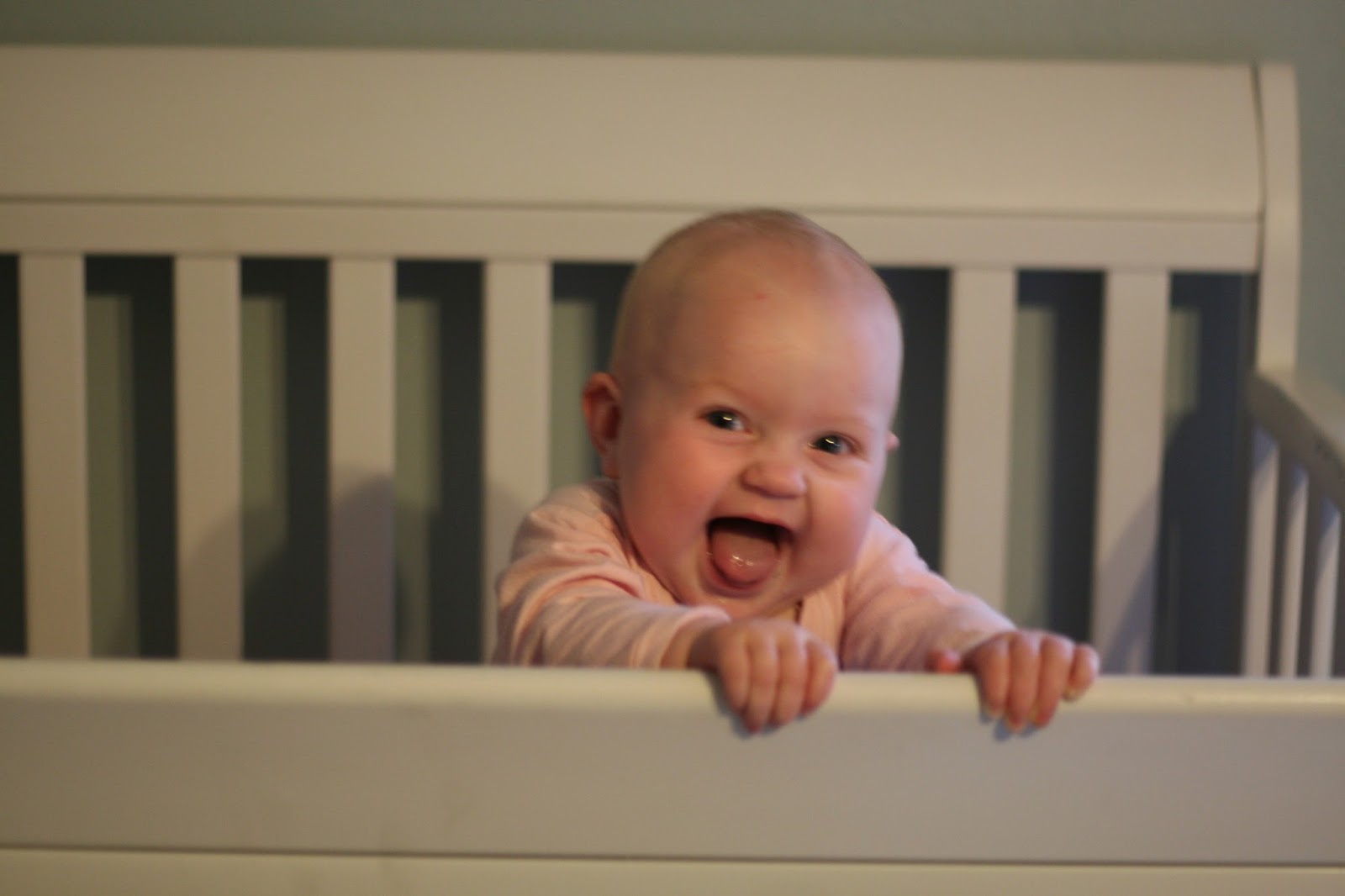 When Knut was setting up this mini crib, we were trying to decide how low to put the mattress. After it was set, we set Ingrid in there to see how she looked in it. She squealed, and Knut said, “She’s almost ready to pull herself to a stand.” I said, “She’s been trying but she’s not quite there. I’d give it another week.” Much to our surprise, in the next 10 seconds she pulled herself up to a stand right in front of us in the mini crib and she practically screamed with her delight in the accomplishment. I don’t think I’ll ever forget the look on her face when she got to the top.