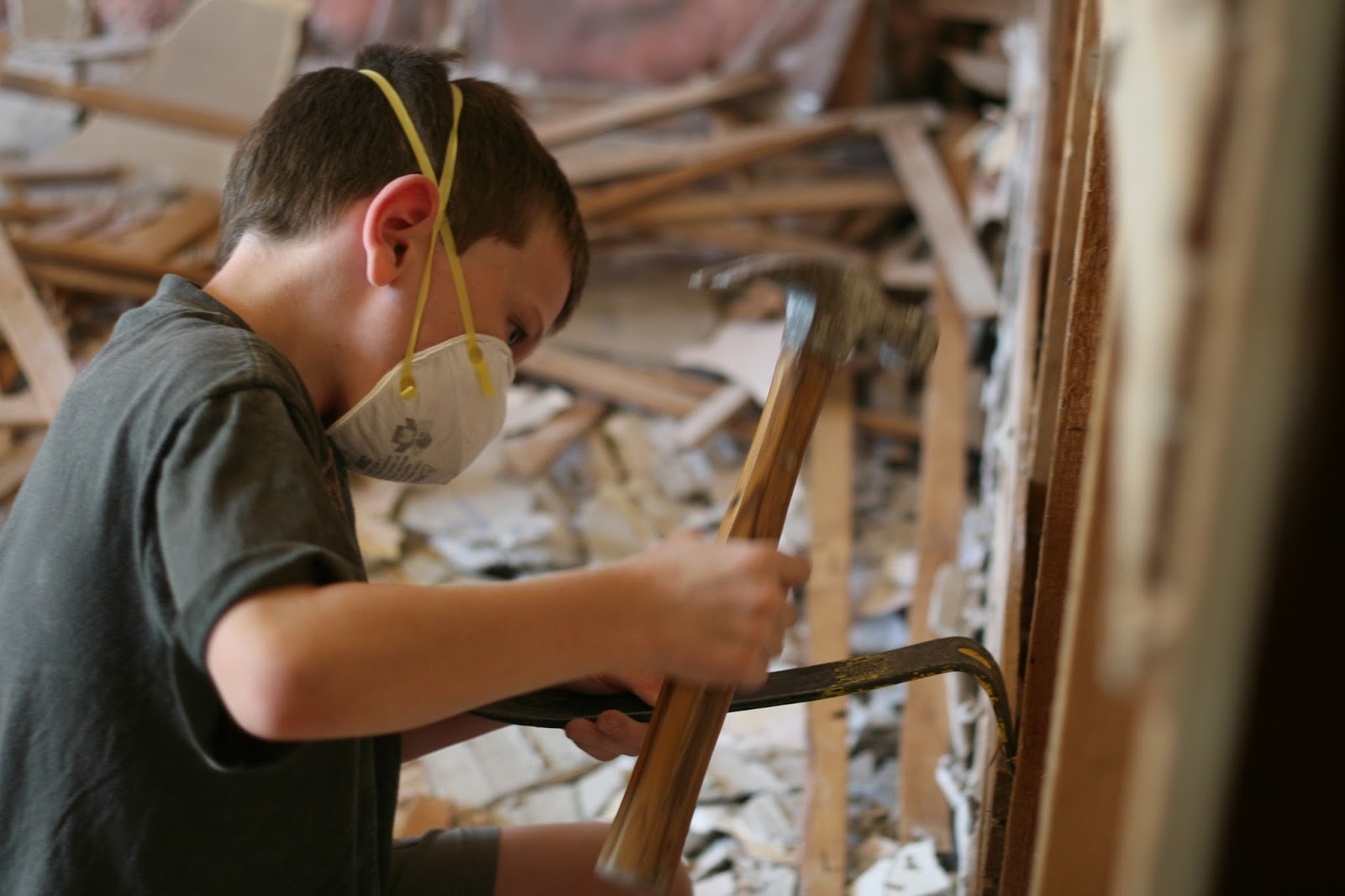 Silje and David really wanted to help with the demolition of the walls. I was so impressed. Silje mostly liked to take a hammer and just pound holes. We got her ripping down stuff that way. David did his work with his well-known intensity. Knut gave him a crow bar and a hammer, and he just got to work as if he’s been doing it for years, ripping down board after board. He may be skinny, but this kid has muscles. My jaw was pretty dropped when I took that picture. Seriously? The kid’s only 7.